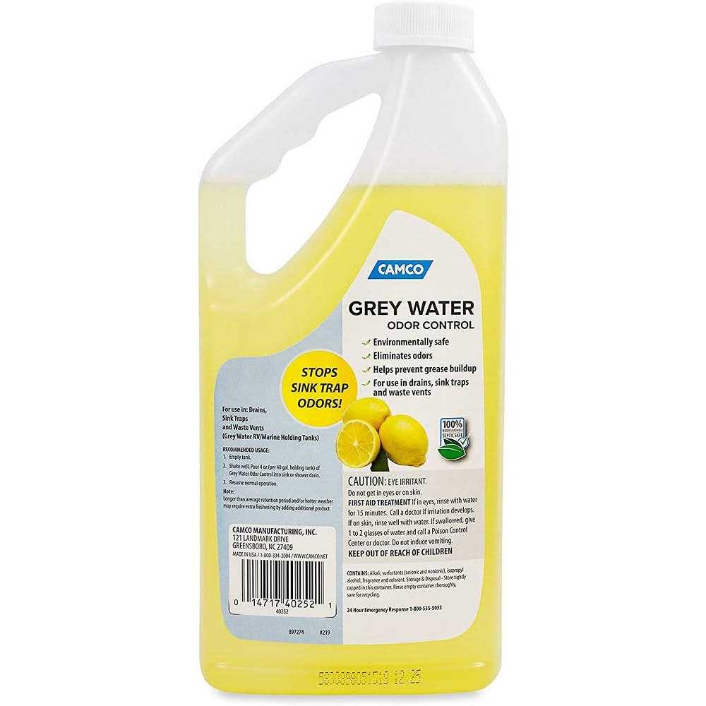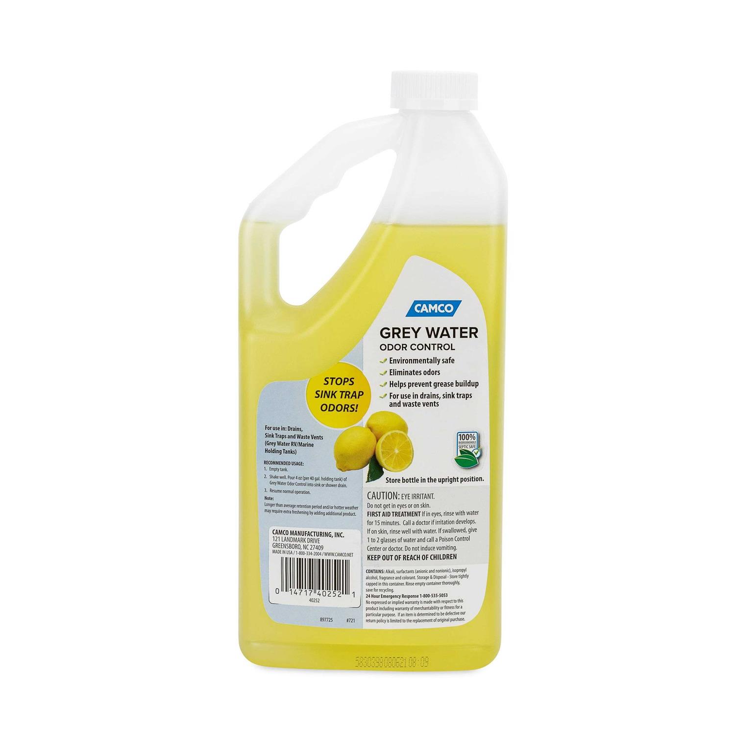 Eliminate odors from rv drains, sink traps and vents with camco’s grey water odor control. Prevents grease build up in holding tank system. Concentrated: use 4 ounces for 40 gallons of tank capacity. 100% biodegradable, non-staining and environmentally safe. Equipment protective formulation with a lemon fresh fragrance.