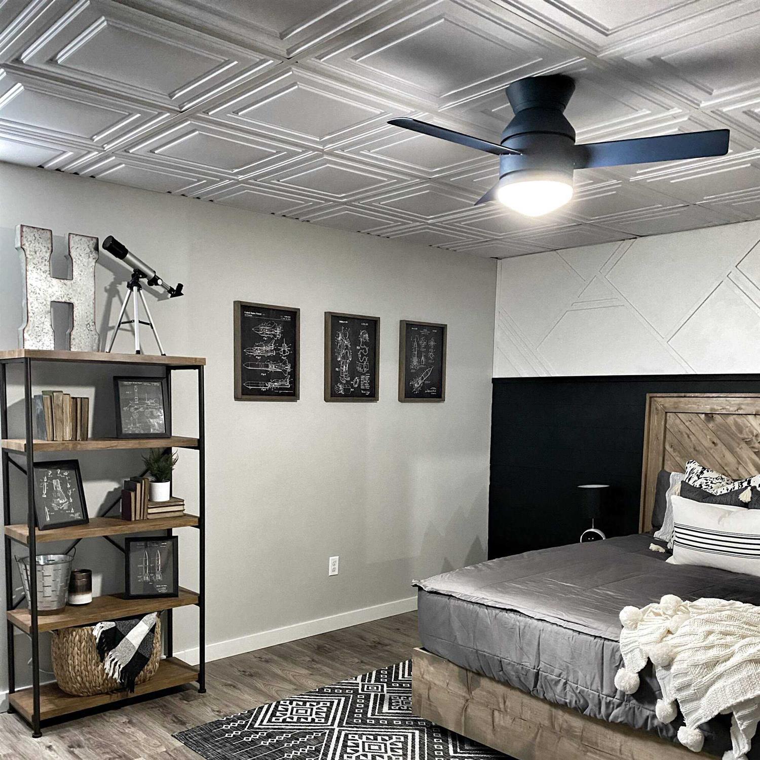 Stratford White Feather-Light Ceiling Tiles are unlike any ceiling tile you will ever see or feel. When you take them out of the box you will be surprised by the minimal weight of their Feather-Light construction. Ceilume Stratford tiles are formed from a thin sheet of vinyl that is only 0.013 in. thick about the thickness of a business card. But the Stratford’s geometric design combined with the inherent strength of vinyl makes these tiles rigid durable and easy to install. The Stratford White Feather-Light ceiling tiles are not at all like the old mineral fiber tiles you’ve used in the past and that’s a good thing. They don’t generate dust they’re unaffected by moisture they don’t harbor mold and they’re easy to cut. Their white finish is bright pure and easy to clean. Place them in your ceiling grid and you’ll be thrilled by the way the Stratford improves the look of your room.