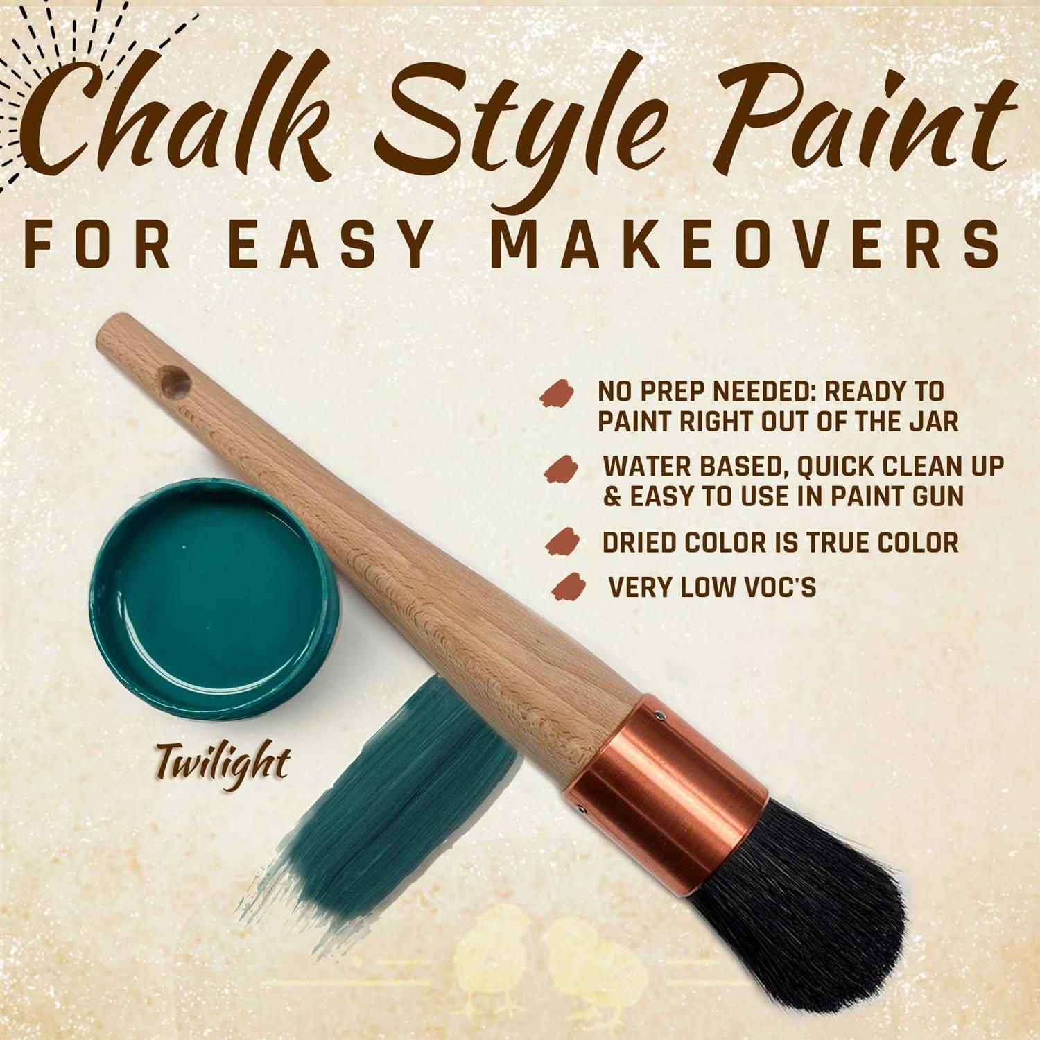 ***Chalky Chicks Renovations & Creations*** Bring your vision to life! From furniture to Mason jars, make your own original work of art. Use Chalky Chicks Matte Chalk Paint for any creative endeavor, from antiquing to crafting for a pop of pure color that can transform any surface. Brush or spray on these rich, highly-pigmented paints for a full-coverage finish in just 1-2 coats. It requires no sanding, mixing, or primer, making it perfect for first-timers, DIY-ers, and restoration enthusiasts. ***Color Outside the Lines*** Our 32 oz, Twilight color chalk paint makes painting a breeze, regardless of your experience level. It can be used on interior or exterior surfaces(exterior needs an exterior top coat) including stained wood, raw wood, laminate, glass, resin, metal, brick, and cement. They can even be diluted to stain fabric! From your dated couch to your fireplace or bathroom cabinet, this ready-to-use paint gives any piece new life, with a matte finish and sleek antique look. ***The Perfect Finish*** From bold and bright to modern neutrals, Chalky Chicks has a paint color for any project. These buttery paints brush on, self level, and dry quickly, with a mess-free finish that wont flake, smudge, or clump. It spreads on for the perfect consistency with no water needed. Whether youre an arts and crafts buff chartering new territory or a homeowner looking to give your kitchen cabinets a country chic or modern update, these matte paints make it easy to get a smooth, even coat the very first time. Projects should be sealed with furniture wax, polycrylic or polyurethane for additional surface protection. ***The Chalky Chicks Way*** 2 Chicks & A Toolbelt Chalky Chicks line was created to give shoppers an easy and affordable way to conquer any painting project! Weve been chalk painting and distressing furniture for 15 years and had to find a way to address our own frustrations with existing chalk painting product lines. From this desire and our personal passion, Chalky Chicks was born!
