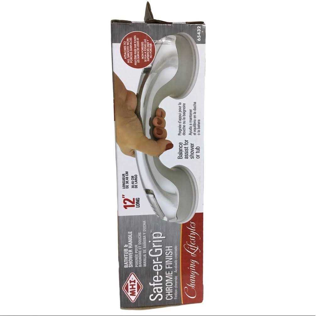 MHI Safe-er-Grip Bathtub and Shower Handle allows the user to enter a wet and slippery tub safely and with confidence. The suction cup design makes the bar easy to attach, remove, or relocate. For intended results, product must be placed on a smooth, dry, non-porous surface. For installation on tile; tile must be 4″ x 4″ or greater. Features a chrome sleek finish with grey under molding. Also features a textured grip for additional stability.
