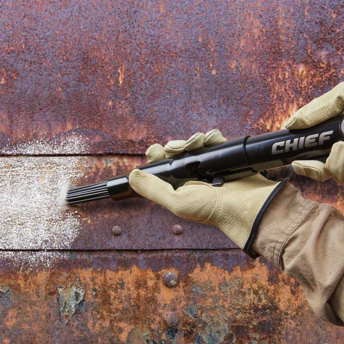 This Professional Air Needle Scaler from CHIEF features durable, hardened steel needles for removing weld slag, rust, paint and dirt. The carbon steel construction provides added strength and durability along with a slim design with a medium barrel for tight, narrow areas. The paddle style trigger provides precise control even with heavy gloves.