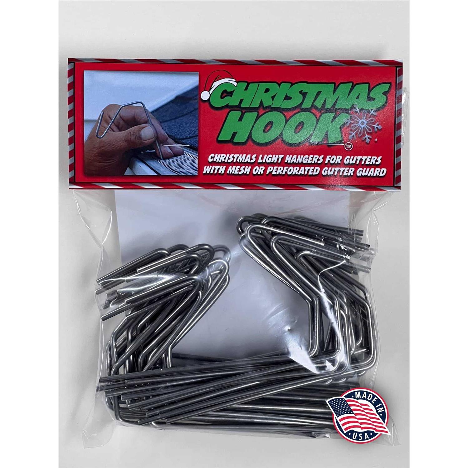 Christmas Hook is proudly made in the USA using the US sourced materials! Easy to use The hooks are 7/64th of an inch in diameter and to see if they will fit your gutter guard take a 7/64th of an inch drill bit and place it into your gutter guard, if the drill bit fits then our hooks will work. Hang your Christmas Lights with ease Not compatible with micro-mesh gutter guards.