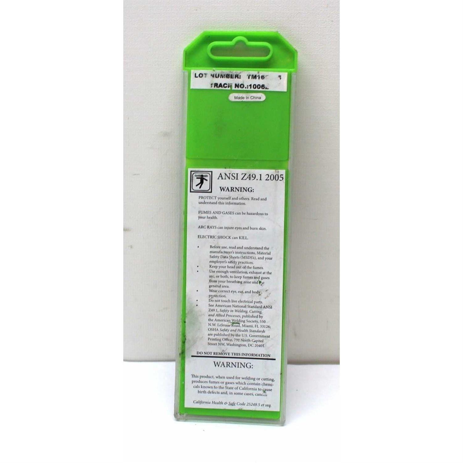 CK T3327GTM LaYZr Tungsten Electrode 3/32 inch x 7 inch, 10 packCK Worldwide Part # T3327GTM Layzr (Chartreuse) EWG Principal Oxides: 1.5% Lanthanum, 0.08% Zirconium, 0.08% Yttrium Oxides Non-Radioactive. Best for automated or robotic applications in Alternating Current (A/C) or Direct Current (D/C) due to low voltage tolerance (changes in tip to work piece distance) using inverter or transformer based constant current power sources. Good for low-alloyed steels, non corroding steels, aluminum alloys, magnesium alloys, titanium alloys, nickel alloys, copper alloys. Very stable tip geometry, runs cooler than 2% Thoriated with longer life, low to medium amperage range. Very best low amperage starts.Non-Radioactive. Best for automated or robotic applications in alternating current (a/c) or direct current (d/c) due to low voltage tolerance (changes in tip to work piece distance) using inverter or transformer based constant current power sources. Good for low-alloyed steels, Non corroding steels, aluminum alloys, magnesium alloys, titanium alloys, nickel alloys, copper alloys. very stable tip geometry, runs cooler than 2% thoriated with longer life, low to medium amperage range. very best low amperage starts.