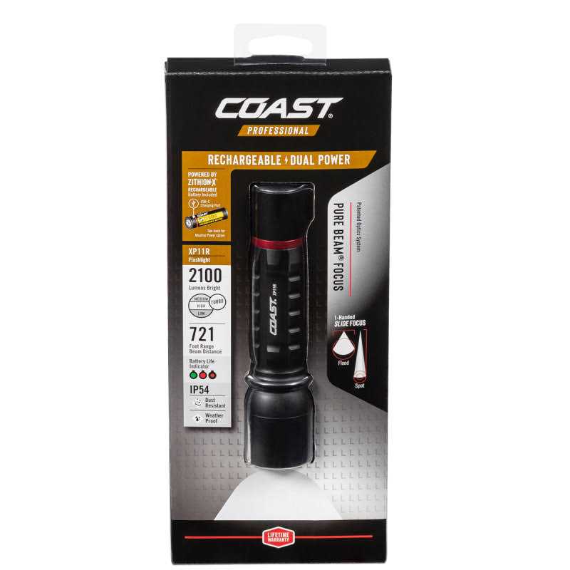Cut through deep darkness. The COAST XP11R showcases how power meets performance in our XP professional series, delivering ultra-bright light and four-mode, multi-beam capability at up to 2100 lumens on Turbo Modebold enough for midnight searches but weighing in at less than 6 ounces. Featuring COAST Rechargeable Dual Power technology, this IP54 dust-resistant and storm proof flashlight is powered by a COAST ZITHION-X? rechargeable battery (charging cable included) but can also run on standard alkaline AAAs (purchased separately)with a real-time power indicator so that you always know when to power up. COAST-patented SLIDE FOCUS optical technology shines the Ultra View Flood Beam and BULLS-EYE? Spot Beam with seamless transitions at up to 220 meters.