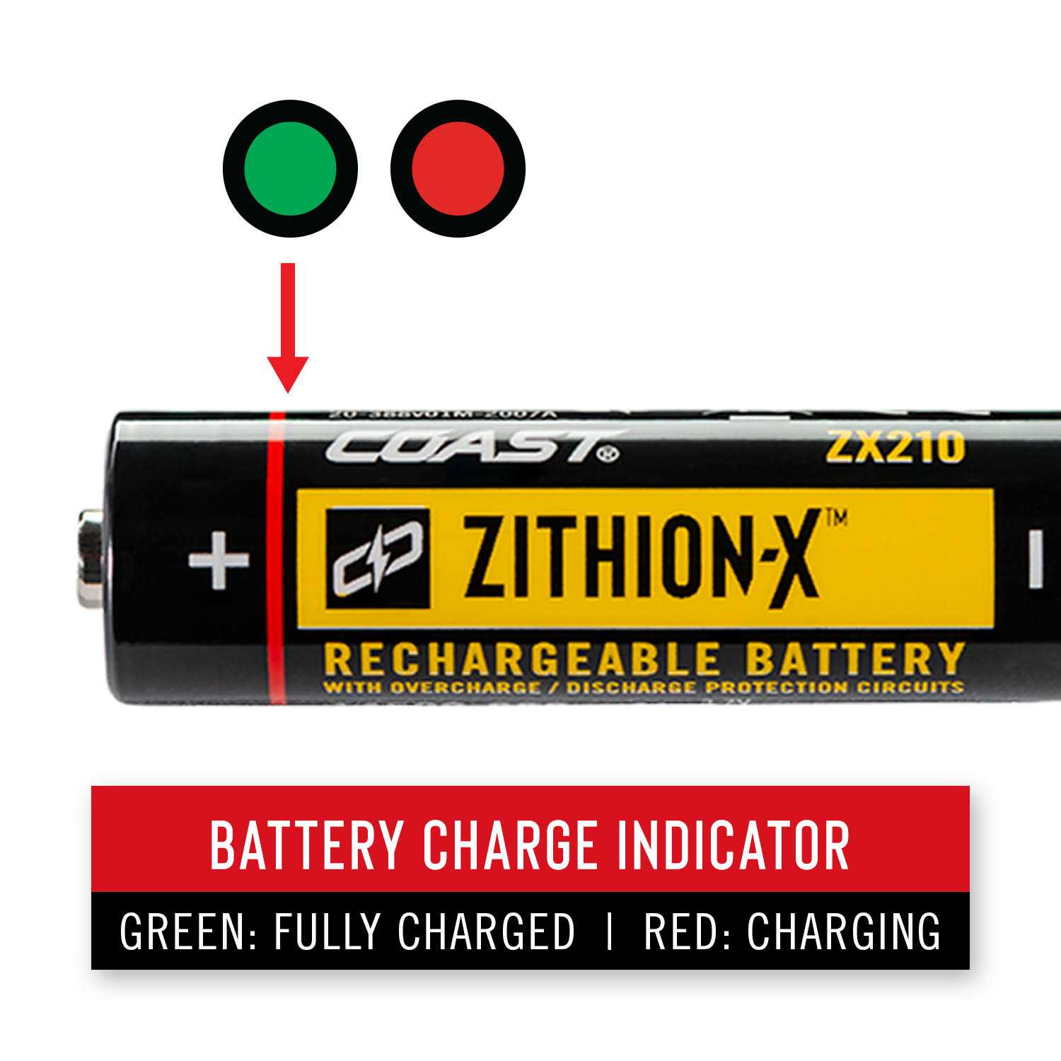 Power up and keep at it. Compatible with COAST HX5 and HP1 flashlights, the ZX210 ZITHION-X rechargeable lithium ion battery features a built-in Micro USB port for easy charging outside the light. A battery charge indicator flashes red during charge-up and shines solid green when fully charged, and the overcharge/discharge protection circuits make powering up as simple and safe as possible.