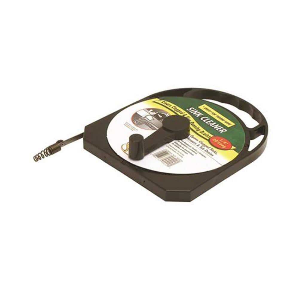 Designed for most small household drains, this 1/4 in encased sink cleaner helps clear 1-1/4 to 2 in drain lines, up to 20 ft long. Features oil tempered spring steel. Comes in a self-storing poly case with easy wind-up handle.