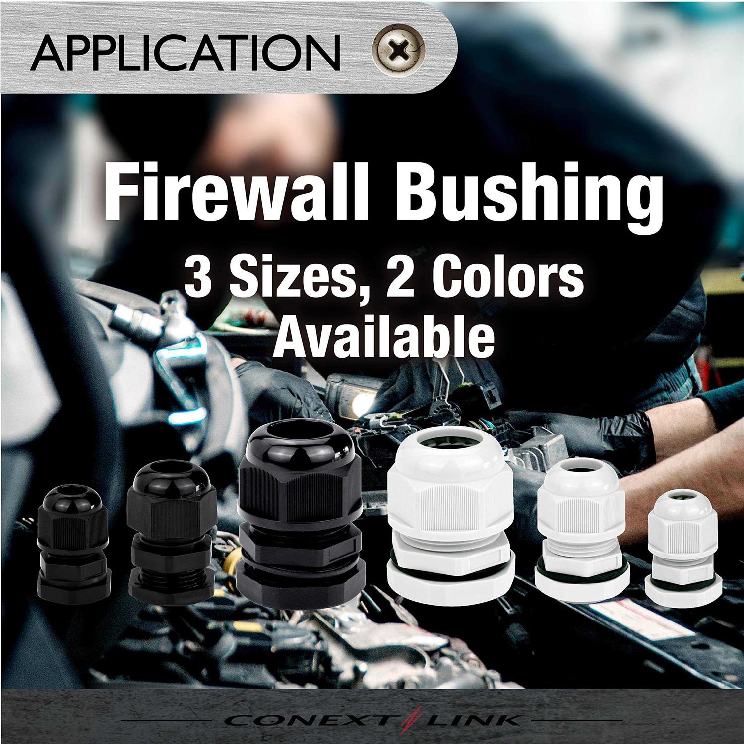 Nylon Body with Neoprene Seal Waterproof IP Protection:IP68 SIZE:PG21 12.5~18mm, PG13.5 7~12.5mm,PG9 4~8mm Color:black/white 5pcs Firewall Bushing 1/0AWG **Good for 1/0AWG Cable **Nylon Body with Neoprene Seal **Waterproof and Air Leak Seal, IP68 Protection Grade **Lock Securely as Bushing is Tightened