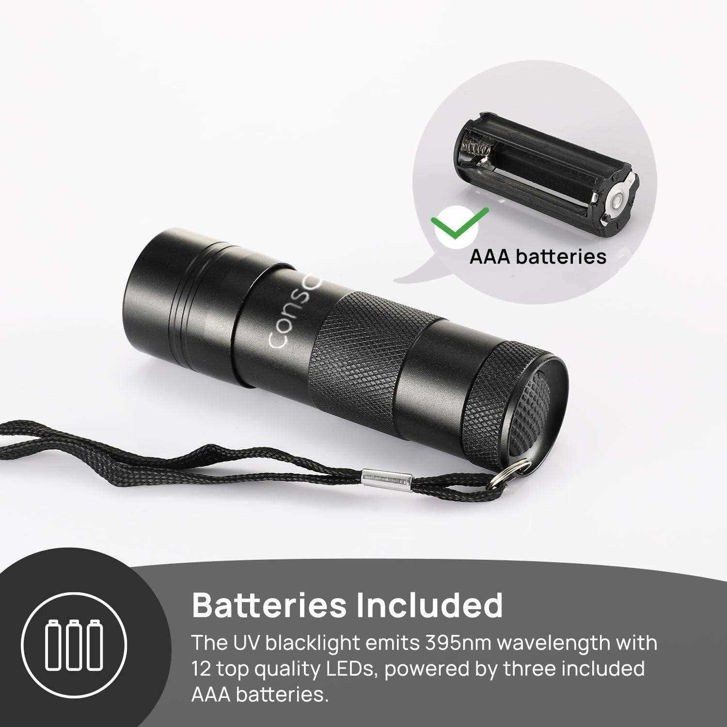 - Batteries Included: The UV blacklight emits 395nm wavelength with 12 top quality LEDs, powered by three included AAA batteries.