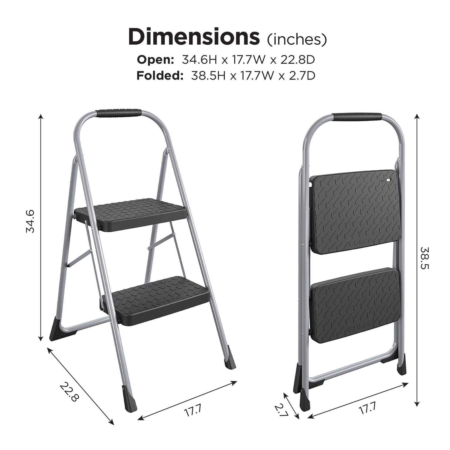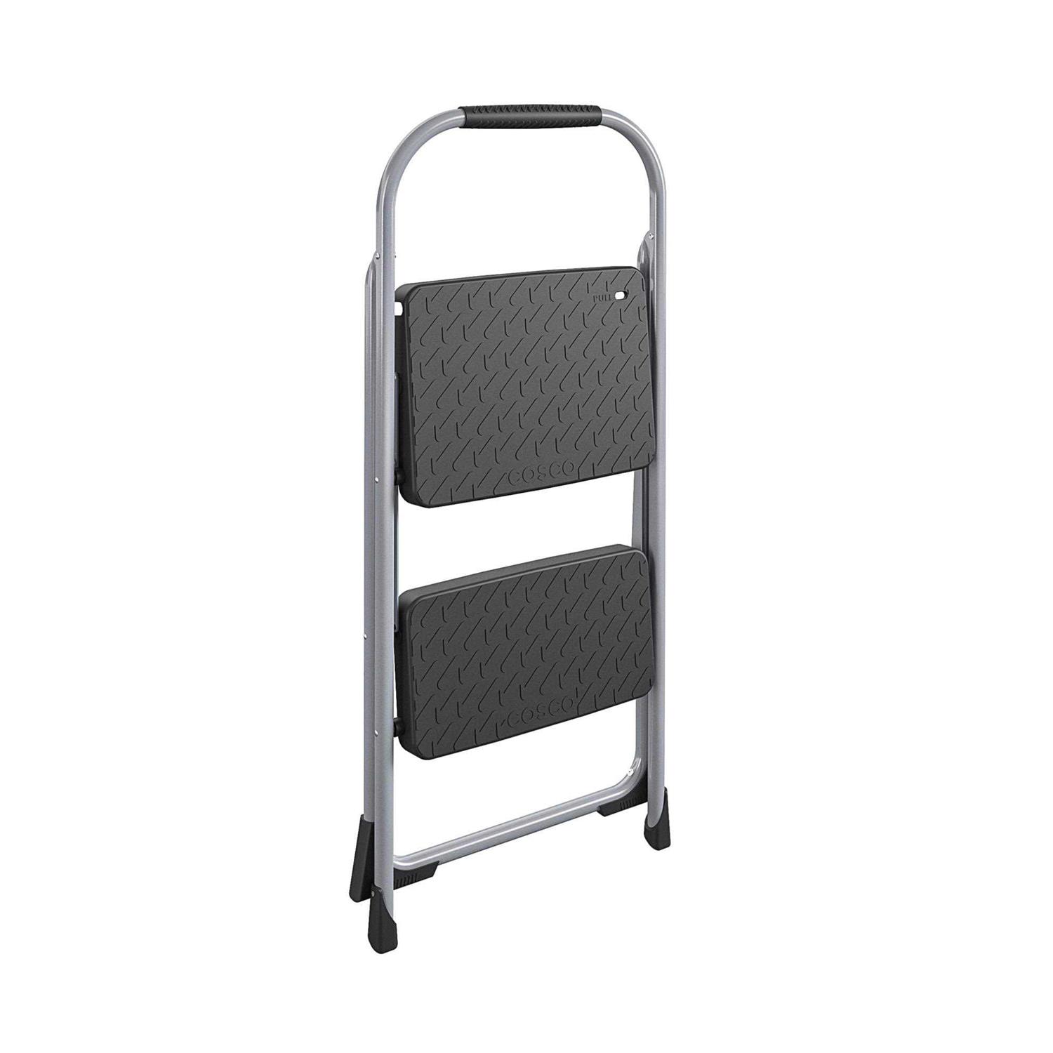 The COSCO 2-Step Big Step, Step Stool makes household tasks less of a chore! Built for adult use (Age 12+), with an 8 Ft. 2 in Max Reach*, the Platinum and Black Step Stool fits into any room. Steel step stool has large, heavy-duty injection molded polypropylene resin steps with ribbed, slip-resistant treads. Built with continuous rear leg support, there is increased stability along with a comfortable handgrip. The built-in non-marring leg tips keep your floor clean and damage-free. The step stool also folds flat, convenient for storage and transportation. *Max Reach assumes a 5 ft 6 inch person with a vertical 12 inch reach.