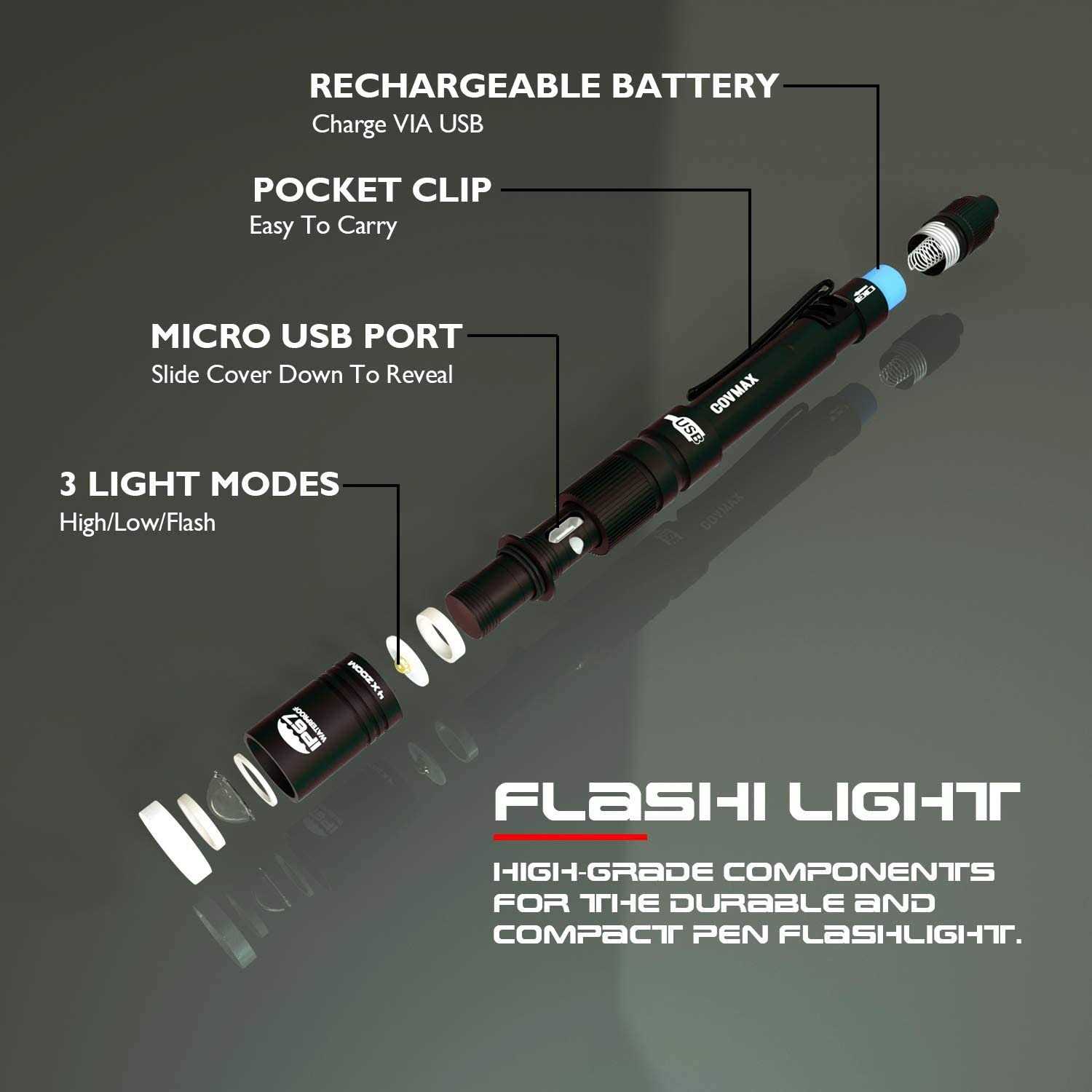 COVMAX Rechargeable Pen Light Flashlight IP67 Waterproof with Pocket Clip 4-Zoomable, Prefect Pocket Flashlight for Inspection,Work,Repair