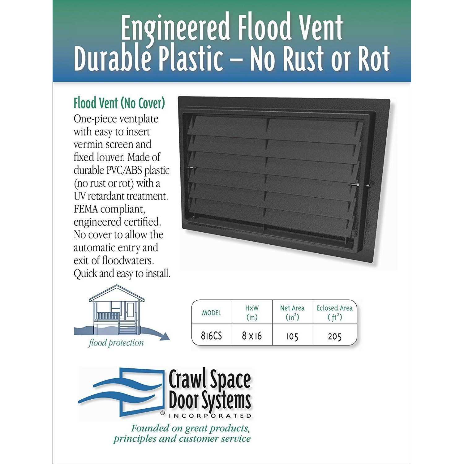 This crawlspace door has a 16″ height x 32″ width opening with a frame for surface mounting directly to the foundation wall. ( Total Dimensions=22″x38″ ) Nothing goes into the opening! This crawlspace door is used for crawlspace foundation ventilation in the summer and closing the crawlspace foundation in the winter. It is also excellent for closed, sealed, encapsulated or conditioned crawlspace applications. The crawlspace doorlid can be easily insulated for cold climates. The doorplate is a one-piece construction designed to fit eight standard sizes and many other sizes. They are made of durable ABS plastic (no rust or rot) with a UV retardant. The crawlspace door is excellent for repairing, remolding and new construction. The crawlspace foundation door comes with a doorplate, vermin screen, louver, lid and installation hardware. The louver and lid are attached to the doorplate by inserting a plastic pin through each side of the doorplate. Product benefits include quick and easy installation with an outside flange that mounts directly to the outside surface of the foundation wall, and an inside flange that retains the vermin screen, louver and doorlid. The door allows easy crawlspace access. The doors can be painted with paint made specifically for plastic. Crawl Space Door Systems, Inc. is a company dedicated to designing, manufacturing and marketing superior products.
