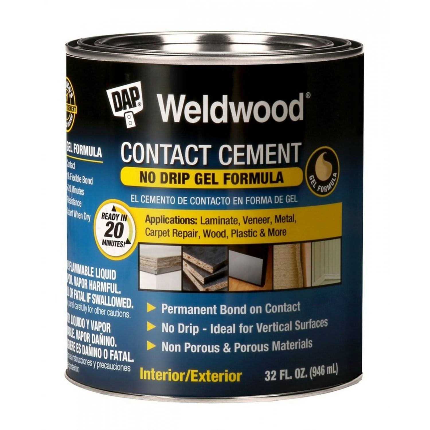 DAP Weldwood gel formula contact cement is a polychloroprene-based adhesive that forms a permanent bond on a variety of surfaces. This professional quality adhesive offers instant adhesion to eliminate the need for clamps or temporary fasteners. Used extensively to bond high pressure laminates for counter tops, tabletops and cabinets. Forms a durable, high strength bond when parts are assembled and momentary pressure is applied.