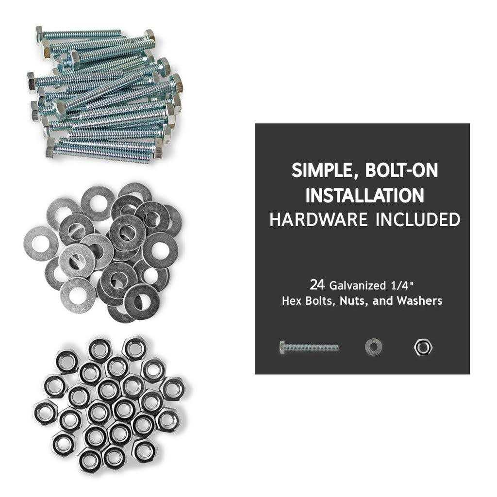 Haul your ATV easily and confidently on your trailer or pickup bed. ATV TIE-DOWN KIT INCLUDES: (4) powder-coated wheel chocks, (2) 7′ E-Track ratchet straps, pack of (24) galvanized 1/4 inch hex bolts, nuts, and washers. FEATURES: Secure ATVs, UTVs, golf carts, riding mowers, and other off-road vehicles to your trailer or pickup bed. E-Track tie-down straps are widely used by commercial truckers because of their industrial-grade strength and reliability. They feature thick polyester webbing with reinforced stitching and powerful ratcheting buckles. Heavy-duty metal ATV wheel chocks prevent rolling during transport. Ratchet straps with E-Track end-fittings snap in and out of slots on wheel chocks for quick loading and unloading. Simple, bolt-on installation. Hardware included. Permanently mounted tie-down system is ideal for those who regularly haul their ATV. 2 anchor slots on each wheel chock accommodate large and small tires. Kit secures two wheels. EASY TO INSTALL: Ride ATV into hauling position, and bolt the 4 wheel chocks in front and back of the two rear tires. Hardware included. EASY TO LOAD: Ride ATVs up and over the chocks installed on the floor until back tires slip between the wheel chocks. Snap one E-Track fitting into the preferred E-Track slot on the wheel chock. Wrap the strap over the tire and snap the second e-track fitting into the other wheel chock. Ratchet to tighten.