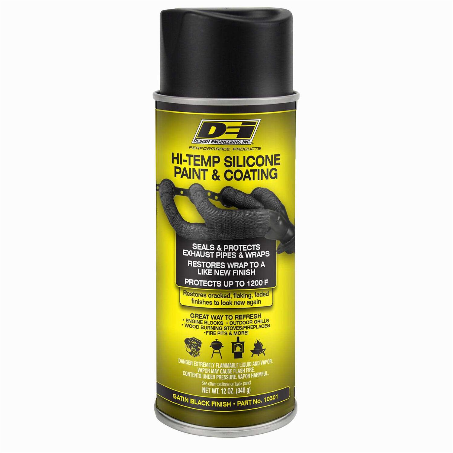 Design Engineering 010301 High-Temperature Silicone Coating Spray – Black HT Silicone Coatings solve the problem of exhaust wraps deteriorating because of dirt and debris hitting them. It seals and protects wraps and extends the life of the wrap. The DEI 10301 High Temperature (HT) Silicone Coating provides lasting protection for any hot surface up to 1500 degrees. DEI recommends using this coating with their exhaust wrap because it seals the material and provides lasting protection from oil, dirt, and road grime. Don’t limit the use to exhaust header wrap. This product works well on headers, blocks, starters, and even on your grill at home. HT Silicone Coating is VOC (Volatile Organic Compounds) compliant in all 50 states. For use with all DEI exhaust wraps, HT Silicone Coating penetrates, seals, and protects, as well as helps to extend the lifespan of all DEI exhaust wraps. See special instructions below for the best adhesion on Titanium exhaust wrap products.