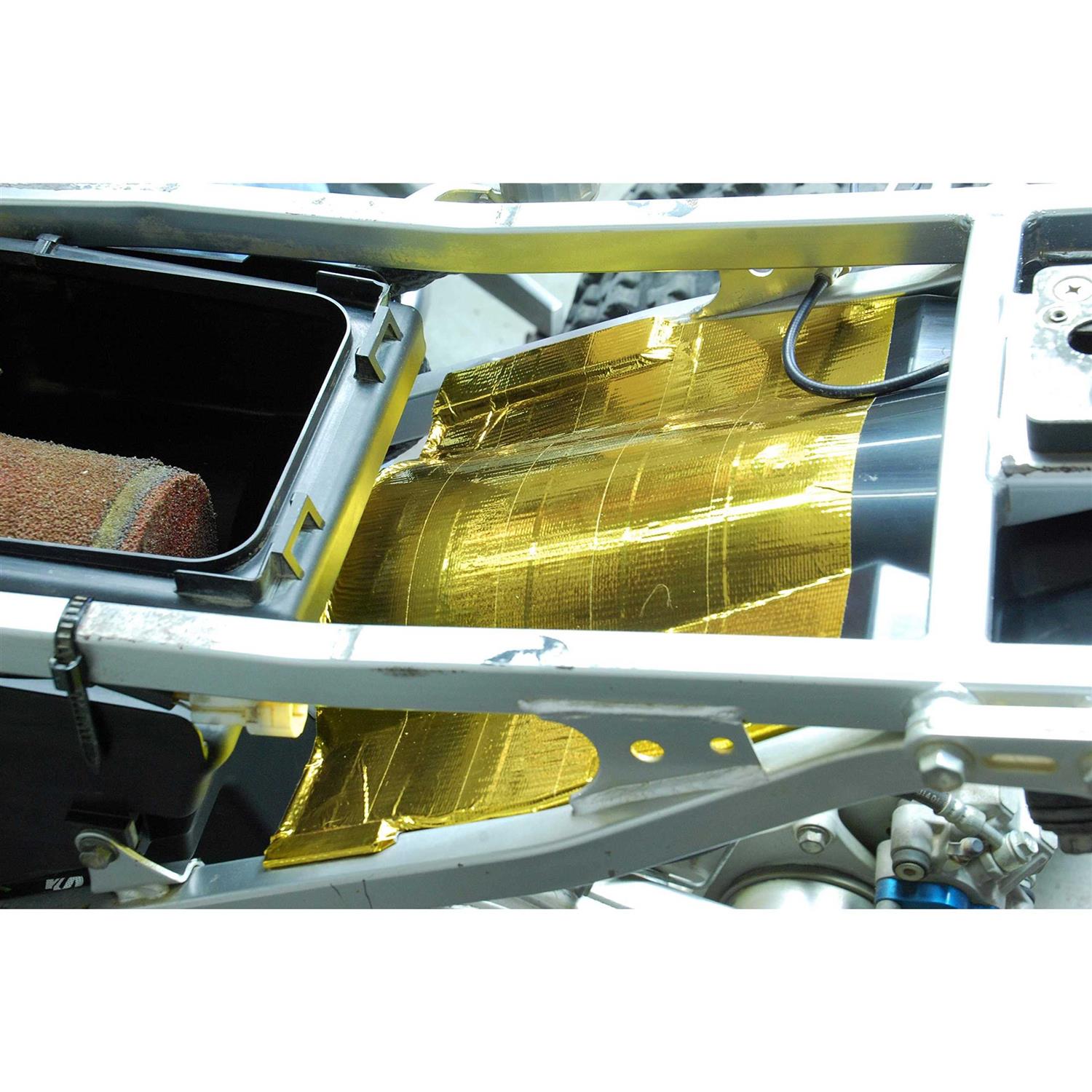 DEI Reflect-A-GOLD is a metalized polyamide polymer laminated glass cloth with a high temperature pressure sensitive adhesive for use in extreme temperature swing environments. It is lightweight and easy to apply and remove. A highly effective material for firewalls, fuel cells, engine covers, under hoods, engine compartment, bulk heads, seat bottoms – anything or area that needs protection from heat. Available in adhesive backed rolls or sheets.