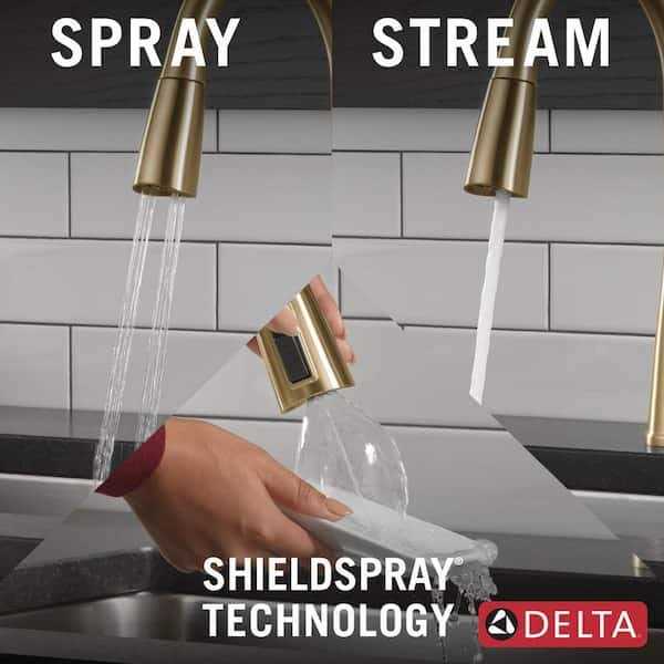 The Greydon Kitchen Faucet was designed with a clean, transitional shape to fit any kitchen setting. Delta MagnaTite Docking uses a powerful integrated magnet to set your pull down sprayer precisely into place and hold it there so it stays docked when not in use. ShieldSpray Technology cleans with laser-like precision while containing mess and splatter. A concentrated jet powers away stubborn messes while an innovative shield of water contains splatter and clears off the mess, so you can spend less time soaking, scrubbing and shirt swapping. Color: Champagne Bronze.
