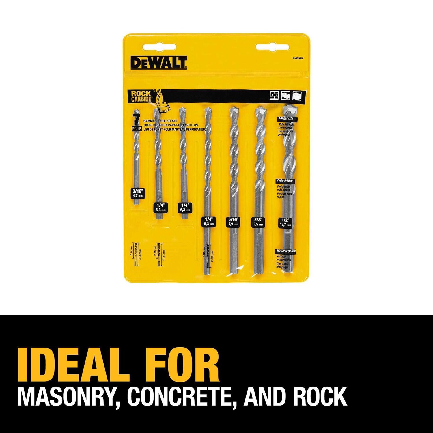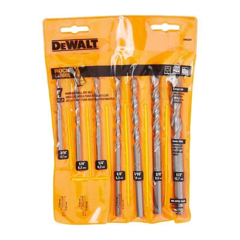 An excellent accessory for your cordless hammer drill, this DEWALT seven piece drill bit set provides function and durability for all your rugged drilling needs. Applications include drilling nice, neat holes into masonry, concrete, rock, and artificial stone. Crafted for the average 3/8 In. and 1/2 In. sized chuck, the bits in this set are intended to make holes for mechanical anchors.