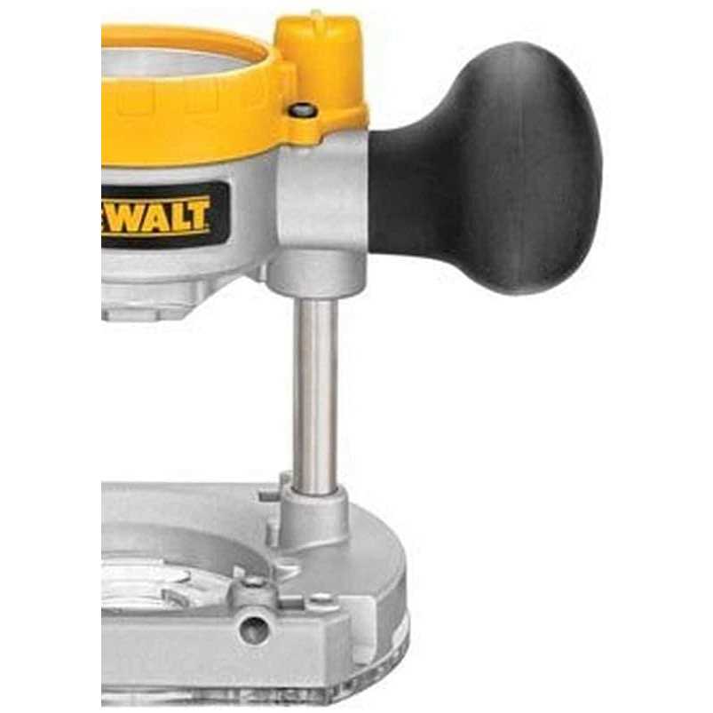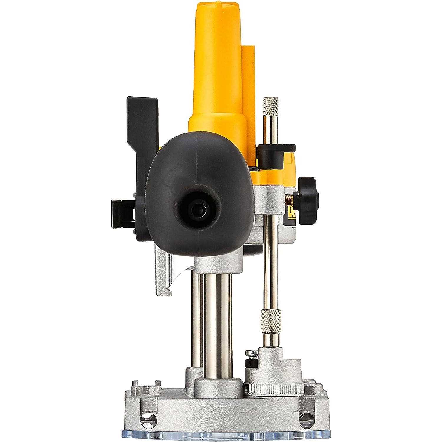 The DEWALT DNP612 Plunge Base for Compact Router has an sdjustable, tool-free steel motor cam lock that makes depth adjustment and base changes quick and solid-locking. It has precision machined brass bushings and case-hardened steel guide rods that provide a smooth and accurate plunge stroke. It has a xlear, LEXAN sub-base to provide enhanced base durability, bit visibility, and accepts standard template guide bushings. The rubber overmolded handles and low center of gravity design provide best-in-class user comfort, balance, and control. IT has a heavy-duty, precision machined, die-cast aluminum base and motor housing for durability and low tool weight. The five position, adjustable turret stop assists in stepped or repeated plunge cuts and it has micro-fine depth adjustment on the plunge base 5/128″ per turn for precise routing in veneer and inlays. It also has an easy to reach plunge lever and switch for superior control while routing.