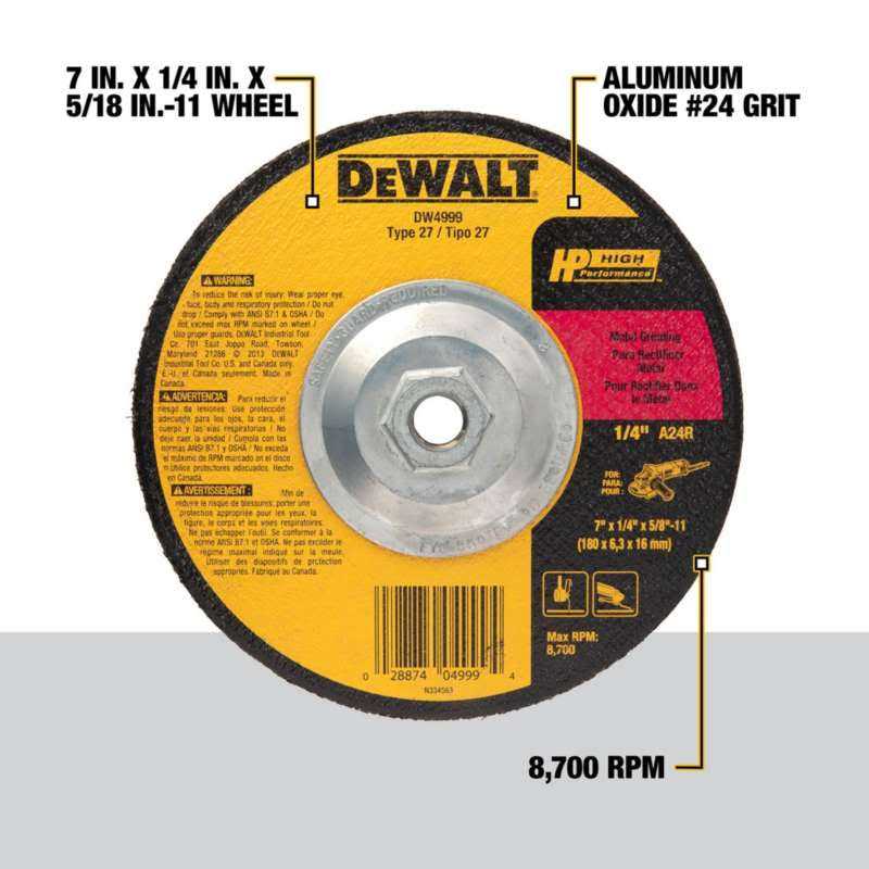 The DEWALT high performance metal grinding wheel is a professional solution for a range of grinding applications. The grinding wheel is made with high performance aluminum oxide for long life and high material removal and 3 full sheets of fiberglass for durability and safety. DEWALT developed a proprietary material mix to maximize the wheel’s lifespan and help you minimize tool replacement costs. With a high grain concentration, you are assured of aggressive grinding action and smoother running wheels, no matter what the job.