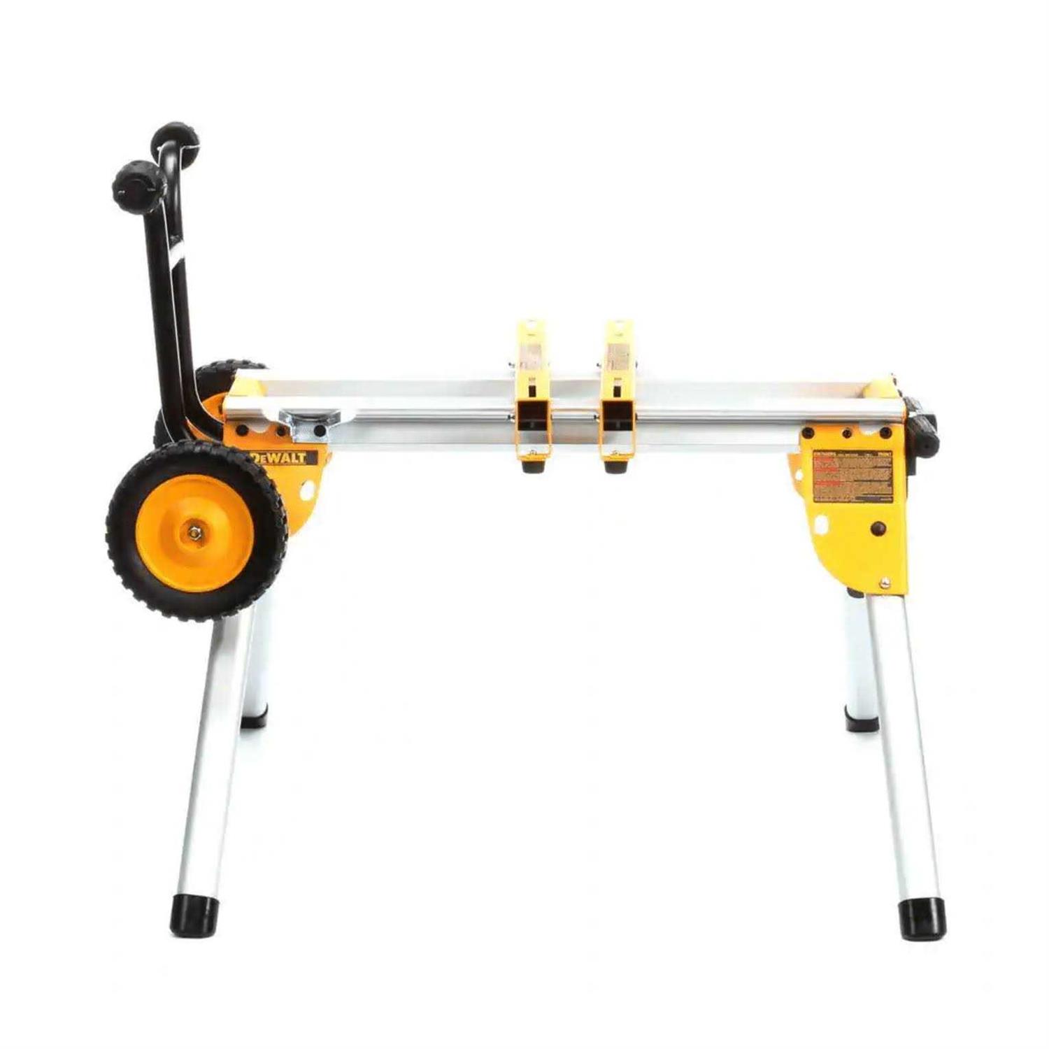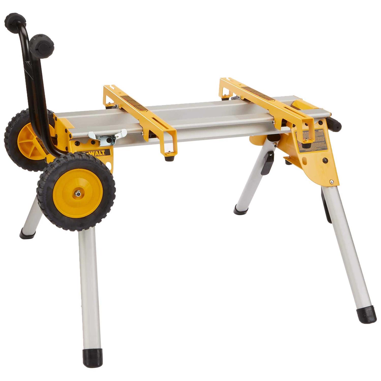 Versatile and dependable, the DEWALT Rolling Table Saw Stand pairs heavy-duty aluminum construction with innovative details. It keeps your work at an ideal height while helping you keep work pieces under control for accurate cuts. Plus, at just 33 pounds with folding legs and convenient heavy-duty wheels, it is built for easy transport. Although it’s built for easy portability, the Rolling Saw Stand does not compromise on performance. Thanks to its aluminum construction, this table saw stand is both strong and lightweight. At just 33 pounds, the stand is easy to transport to and from jobsites, which allows you to take advantage of having a versatile, stable saw setup–no matter where your job takes you. It can handle loads up to 200 pounds. The stand’s wide base and rear offset legs are designed to provide stability and support for feed control. In between jobs, quick-release levers allow the legs to be folded for more convenient storage, and a heavy-duty kickstand allows the unit to stand upright with the saw still attached for improved mobility and more convenient storage. For added convenience when loading and unloading, special quick-connect stand brackets attach to your saw to make detaching the saw from the stand incredibly easy.