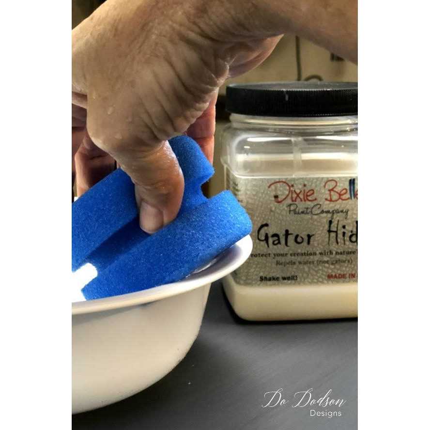 Dixie Belle’s Gator Hide is a water-based acrylic finish, designed for high traffic areas like cabinets, counter tops, table tops, and outdoor furniture. This clear coat is water repellant and super tough. To use: Let your painted surface dry completely. Using a dry sponge or brush, apply one thin coat of Gator Hide. Let dry completely for 2 hours. Apply a second or third thin coat as desired, leaving 2 hours between each. Let cure for 48 hours before using the surface.