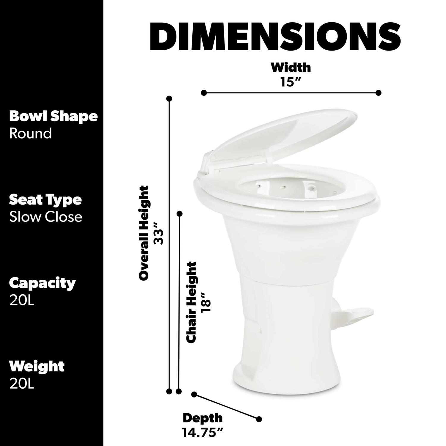 The Dometic 310 toilet is the best of all worlds. A value priced toilet, the Dometic 310 features revolutionary powerflush technology and a china bowl. True, 100% bowl coverage. Tasteful and elegant Euro design. Lightweight and strong – 100% china. Innovative industry-leading drop away ball and valve with new seal-tight system. Powerflush, swirl-jet bowl rinse action ensures a cleaner rinse. Comfortable 18″ ergonomic seat height. Includes mounting bolts and seal. Measurements 19″L x 15″W x 20″H.