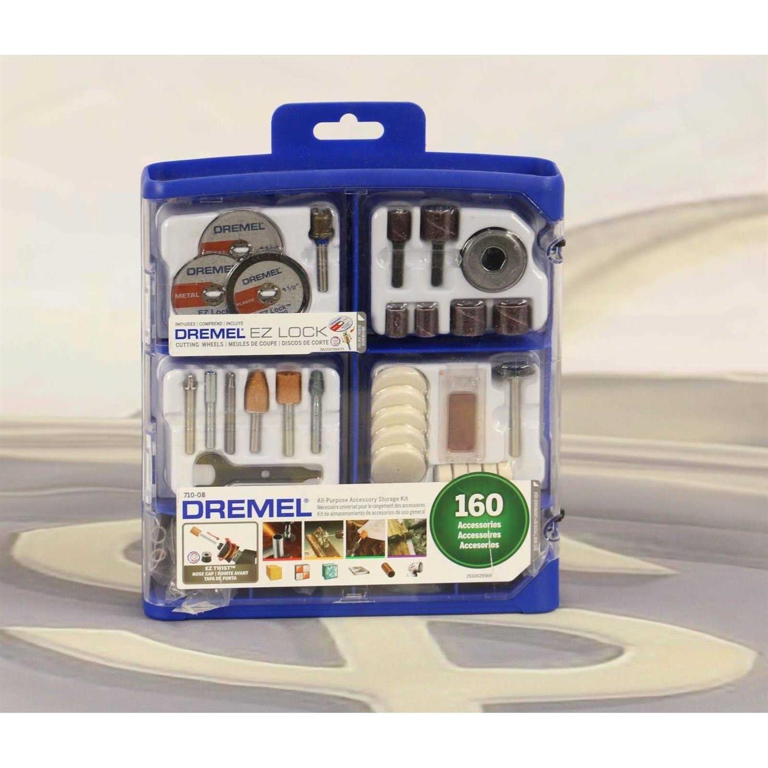 The Dremel 160 piece multi-purpose accessory set offers a breadth of high-quality accessories providing a complete kit to get you started with your Dremel rotary tool. The kit includes the patented EZ Lock accessory system with the EZ Twist nose cap wrench, EZ Lock mandrel and EZ Lock cut-off wheels allowing for quick and easy accessory changes. The included storage case features reusable storage bins and lift-out trays for easy organization of the included bits. This kit is ready for cutting, grinding, polishing, sanding, cleaning and more.