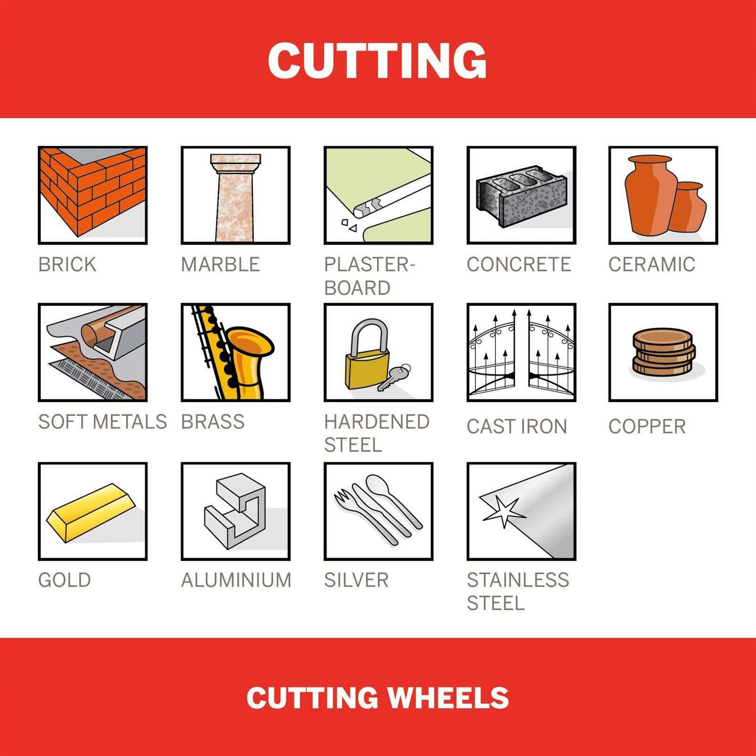- Use to trim castings and molded ceramics, cut screws and rusted bolts, and for slot screw heads