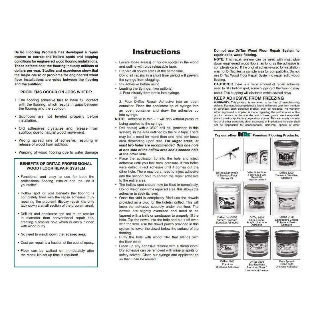 - **DO NOT USE Dritac RS-1 engineered wood floor over sealed concrete. For repairs over concrete , use DriTac SW-1 Solid Wood & Bamboo Floor Repair Kit.