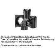 From the DirectVent Pro collection designed to be for direct vent gas or propane stoves fireplaces and heaters brings to you the DuraVent 46DVA-KHA Horizontal Termination Kit A. This kit includes a 90-degree black elbow a 24-inch black pipe a ceiling support/wall thimble cover and an 8 black pipe extension. This is to be for a 4 x 6 direct vent.