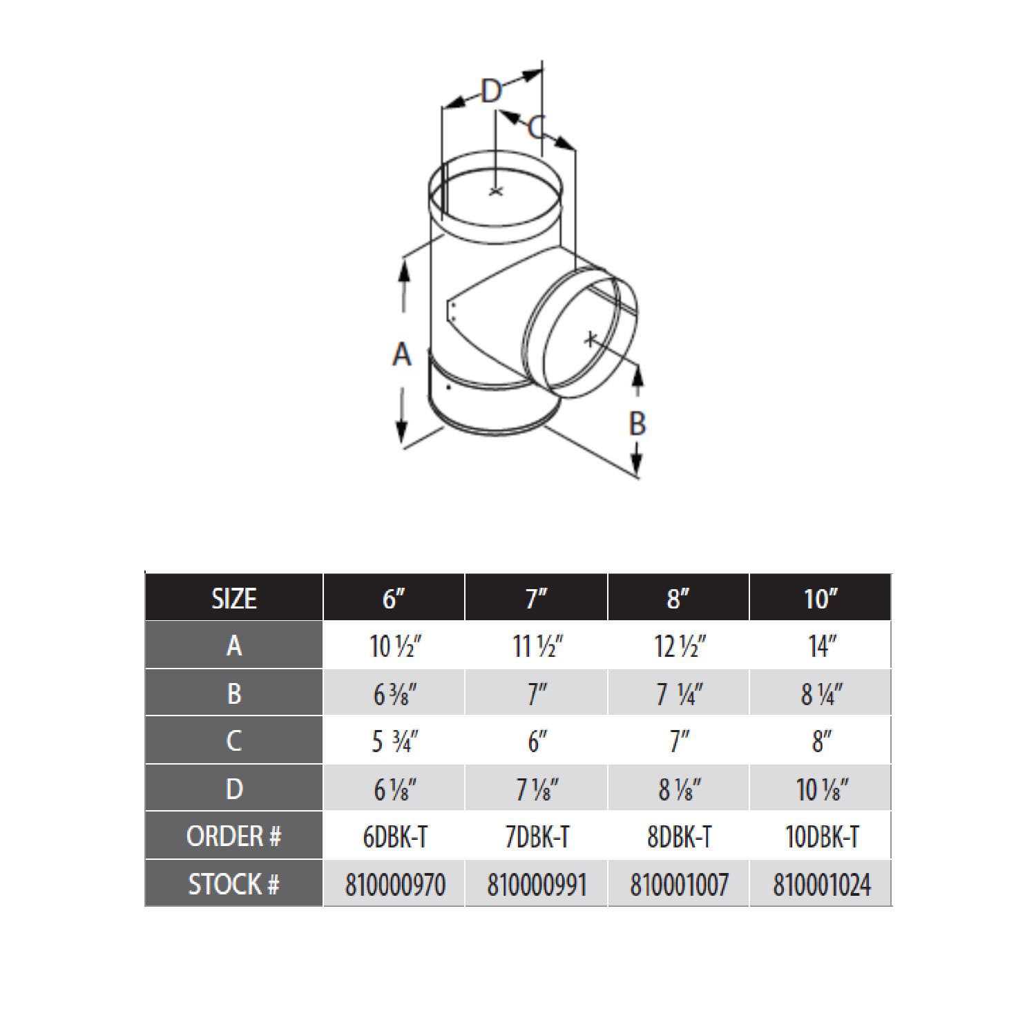 The DuraVent 6DBK-T is a tee with a clean-out cap from DuraBlack a collection designed to be used for your stovepipe systems. This is designed to be used with rear exit appliances and those appliances that require a barometric damper. It has an inner diameter of 6 inches and a length of 10 inches.