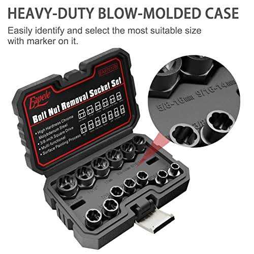 41Cr4 Steel — Each bolt extractor is made of high hardness 41Cr Chrome Steel for ultra durability and tough strength to avoid damage during high-intensity use. Includes 13pcs Extractors — 1/4″, 5/16″(8mm), 3/8″, 10mm, 7/16″(11mm), 12mm, 1/2″, 13mm, 9/16″(14mm), 5/8″(16mm), 17mm, 11/16″, 3/4″(19mm) suitable for use with impact guns, air ratchets, breaker bars, reversible ratchets, spanners. Size Etched on the Surface — Easily identify and select the most suitable size to removal bolt which saves a lot of time, effort, or energy while removing rusted bolts out. Tight Connection — The upgrade twist socket set provides superior connection to increase grip to remove old rusted and stripped bolts. Organized and Easy to Carry — Packed in heavy-duty blow-molded case for easy storage, it’s ok to take it to anywhere whether it is in your garage or factory. Eapele Impact Bolt Nut Removal Extractor Socket Tool Set (13pcs Black)