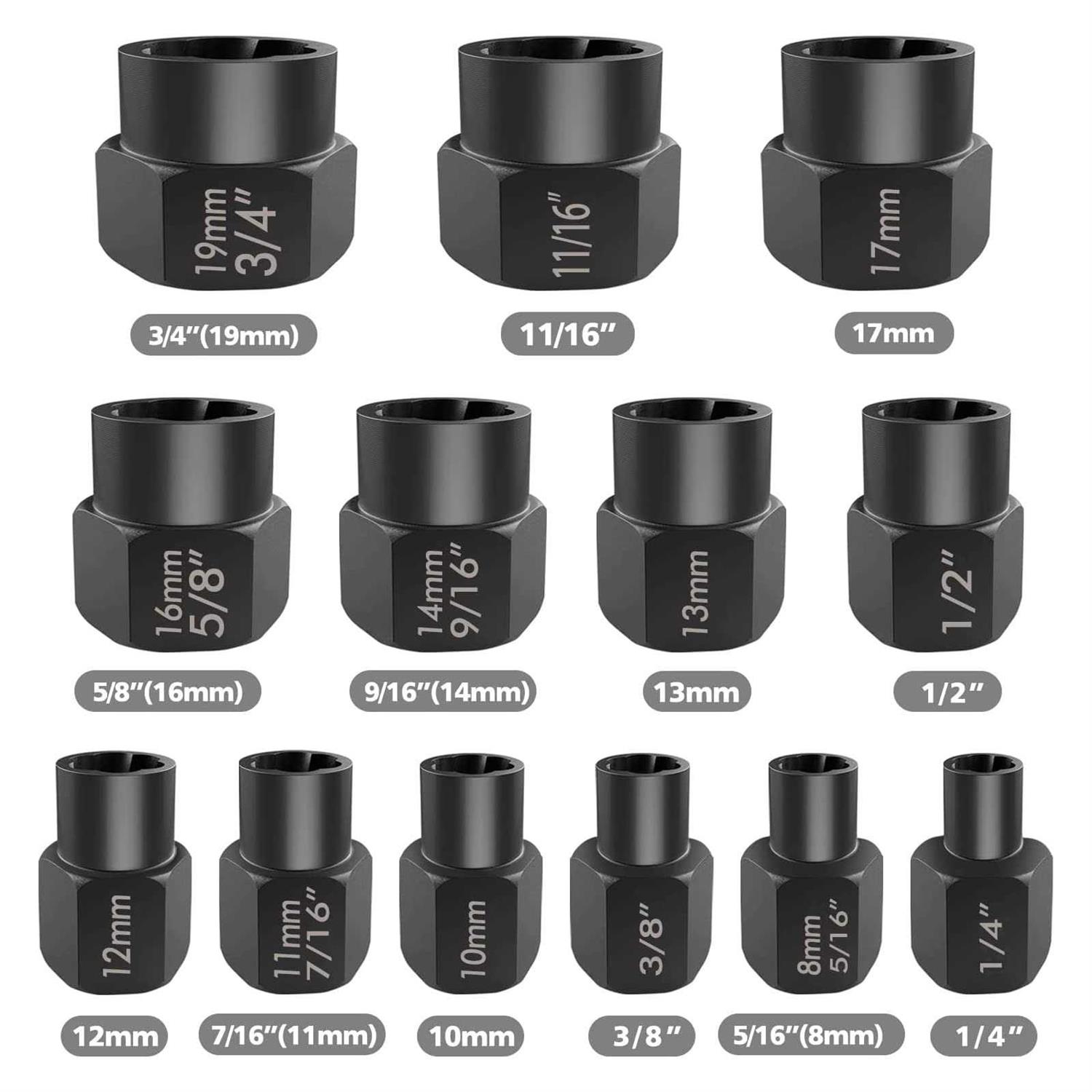 - Sizes: 1/4″, 5/16″(8mm), 3/8″, 10mm, 7/16″(11mm), 12mm, 1/2″, 13mm, 9/16″(14mm), 5/8″(16mm), 17mm, 11/16″, 3/4″(19mm).