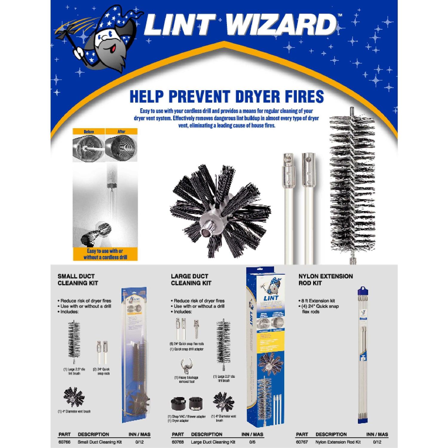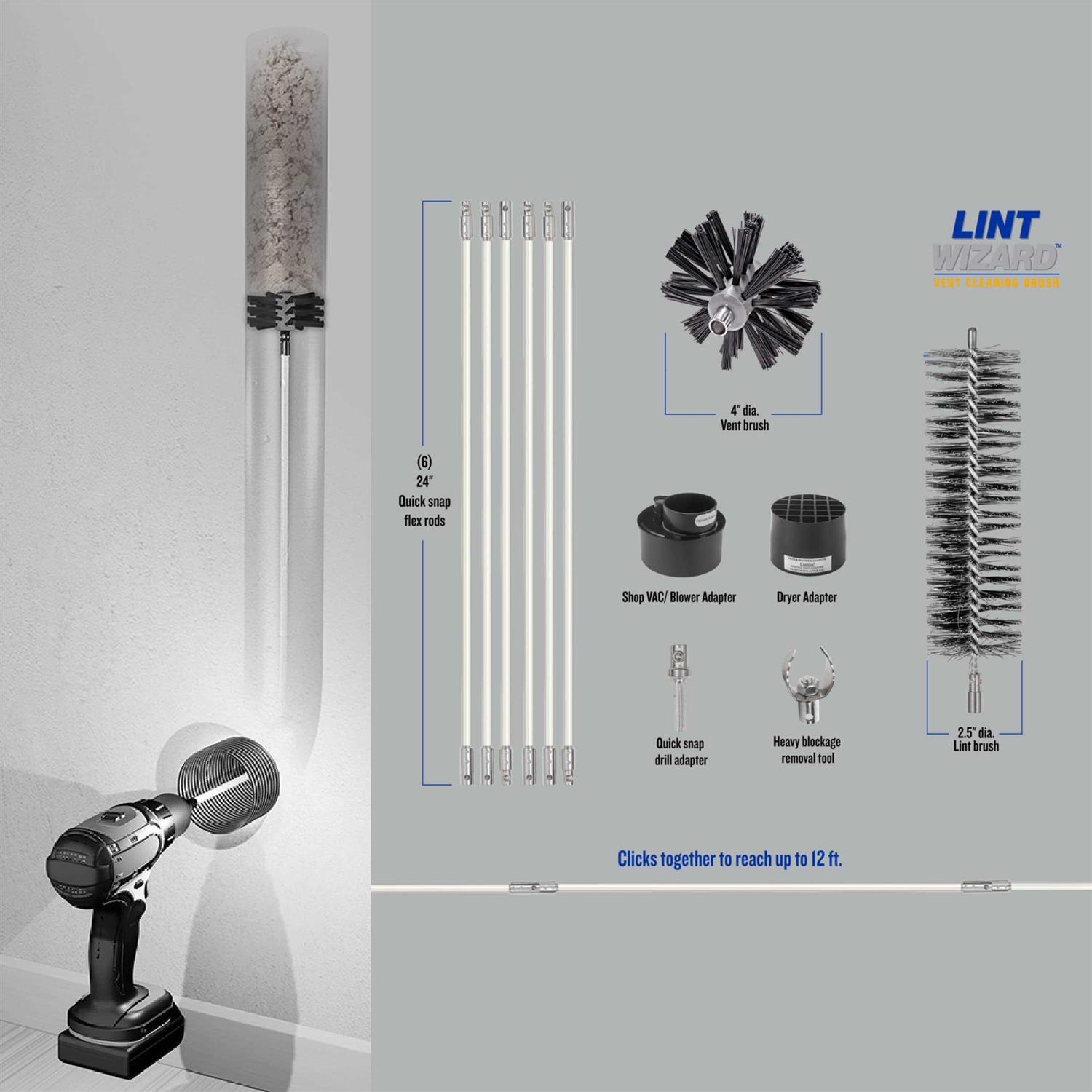 Helps prevent dryer fires by removing lint buildup in the exhaust vent, lint trap and around dryer. Rotating action of the auger brush and flexible rods scours your entire vent wall surface while traversing the multiple turns that are common in most dryer vent systems. Reduces drying times which saves energy and time doing laundry. Exceptional reach also makes it a snap to clean behind, underneath and all around your dryer, appliances, baseboard heating vents and other hard-to-reach areas. Easy to use with a cordless drill.