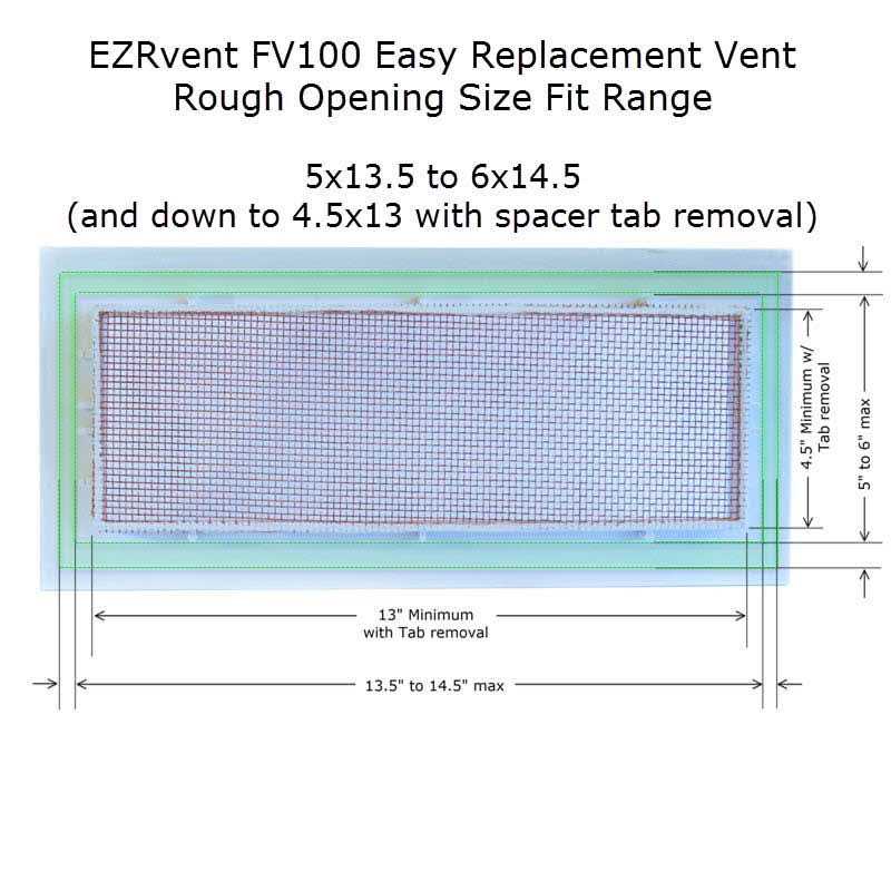 Easy to Install EZRvent FV100-8H: Foundation, Sub-floor, Soffit and Garage Replacement Vent (5 x 14 Rough Opening). – Higher Grade Look & Finish: picture frame shadow box frame with recessed screen. – One size covers range of rough openings 5″ x 14″ (4-7/8″ x 13-½” to 6″ x 14-½”). – Also fits 5″ x 13″ and 4.5″ x13 openings with modification. – Easy & quick labor saving install from outside under 2 min. No stucco or siding replacement required. – Heavy .023 1/8 inch galvanized mesh offers added protection of keeping swarming bees and wasps out. Made in the USA. Applications: – Vents for 16 inch on center framed walls – Vents for Framed, Stucco Concrete, or Masonry walls with 5×14 rough openings – Vents with 5×13 and 4.5×13 rough openings (with easy trim tab modification) – Foundation Vents – Subfloor Vents – Crawl Space Vents – Soffit Vents – Garage Vents – Pest exclusion: Rats, Bees, Snakes and other Critters FV100-8H SPECIFICATIONS: – ⅛” Mesh .023 Galvanized Steel ROUGH OPENING: 5″ x 14″: (Min. 4.85″ x 13.5″ – Max. 6″ x 14.5″) – 5″ x 13″ and 4.5″ x13 openings with modification – NET FREE VENTILATION = 28.9 sq in