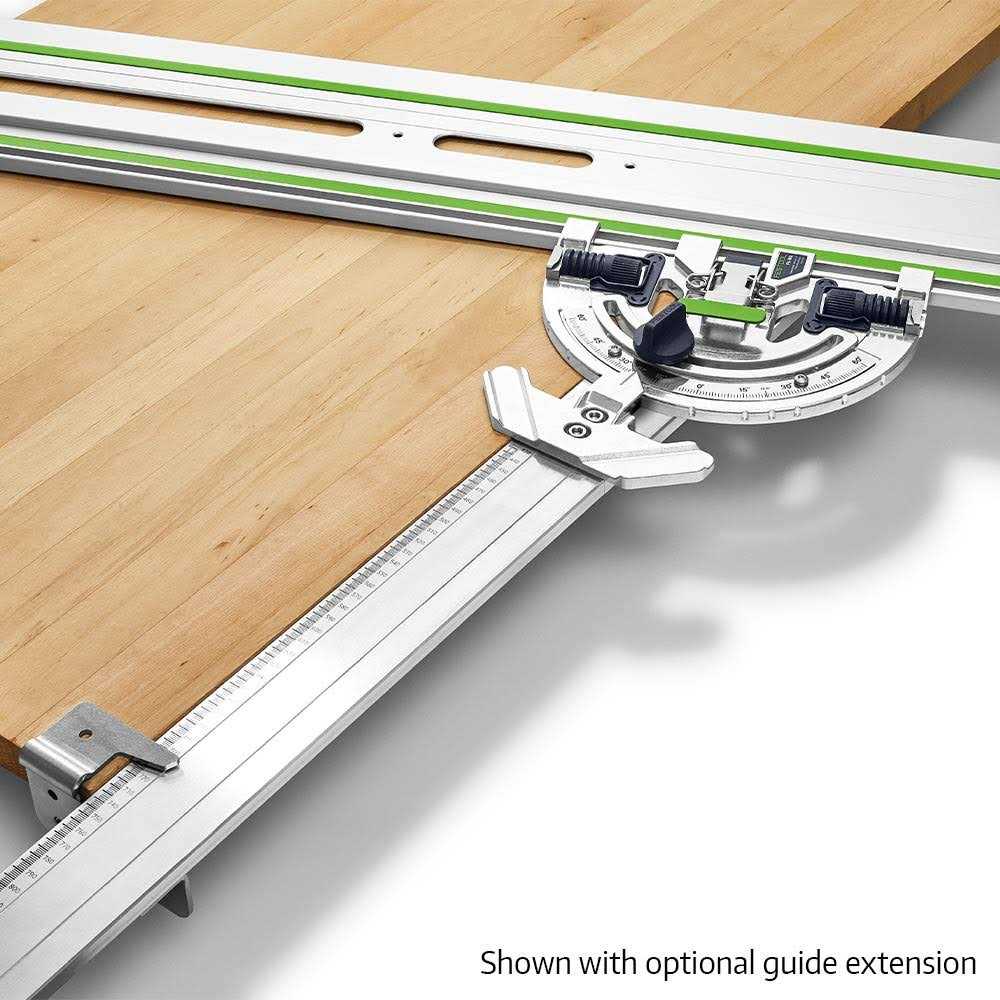 The Festool Angle Stop quickly and securely attaches to your Festool Guide Rail without the need for tools. A quick-clamping lever locks onto the guide rail in an instant. Once attached, the Angle Stop allows you to cut precise angled cuts from -60° to +60° and can be set for repeat accuracy and high precision. It has a long contact edge and viewing window for easy aligning with the workpiece edge. Specific, indexed locking positions for common angles make it easier to use. The Angle Stop comes with a positioning bolt for use against a profiled edge. Optional extras include a fence extension with stop for repeat cuts and guide rail clamps for extra security.