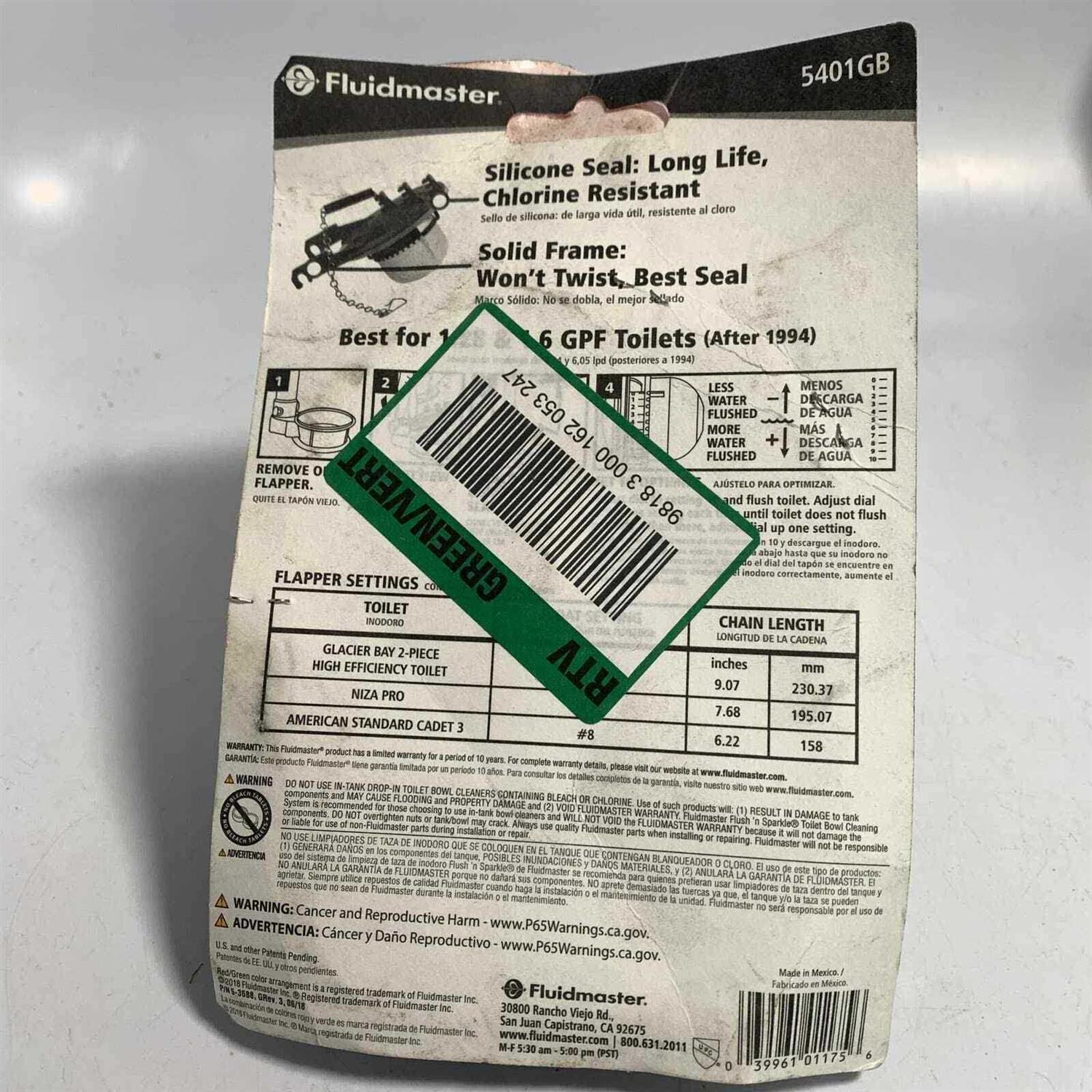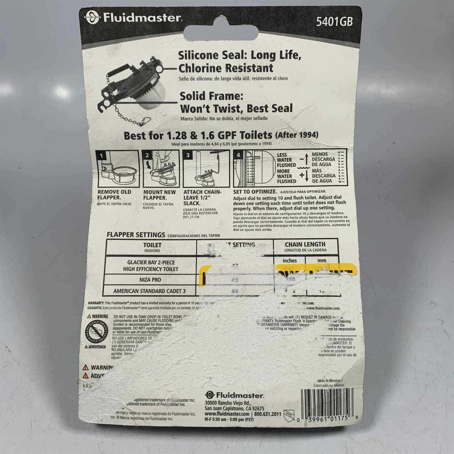 As a direct replacement for Glacier Bay toilets, the 5401GB 3 in adjustable flapper from Fluidmaster helps stop a running toilet and restore factory performance. This flapper also works on other toilet brands. The 5401GB Flapper features a durable silicone seal that lasts up to 10 times longer than regular flappers. A solid frame design keeps the flapper from twisting and ensures the best seal every time. The 5401GB Flapper is also adjustable so you can rest assured you’re saving water with every flush. Adjustable dial for maximum performance and water savings. Adjustable dial for maximum performance and water savings. Chlorine and hard water-resistant. Solid frame for the best seal every time, no twisting. Long-lasting silicone seal.