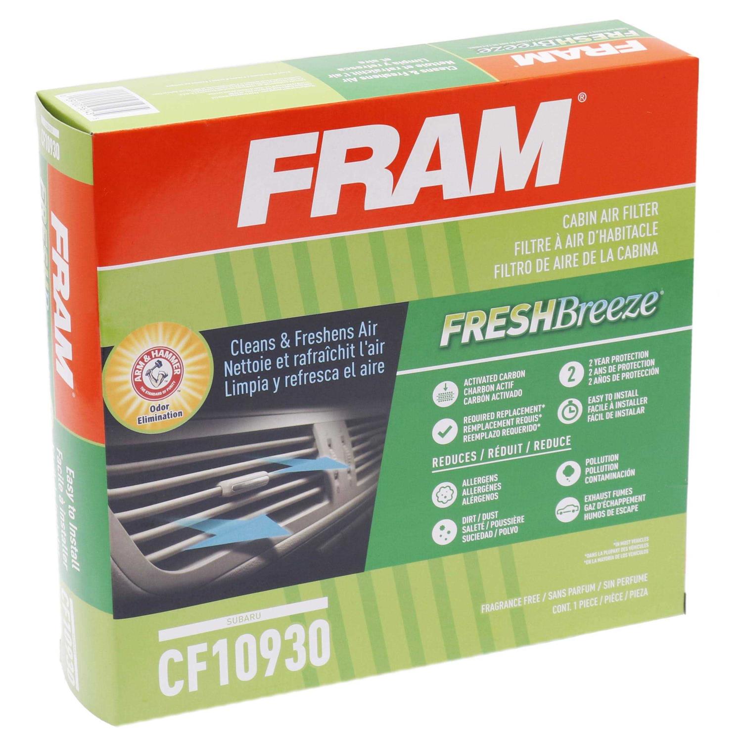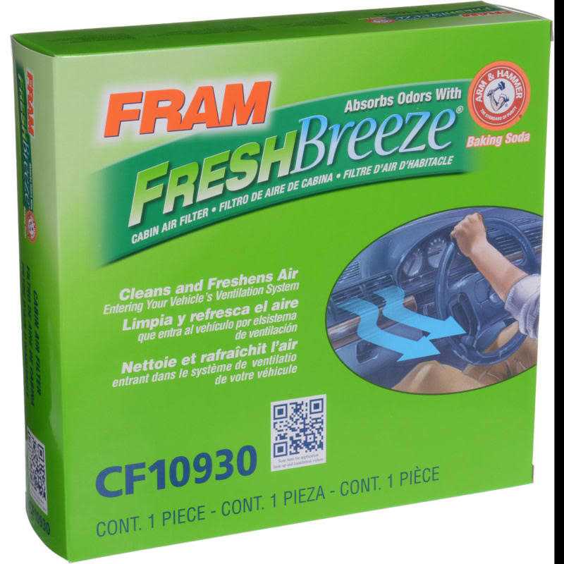 Passenger Compartment Air Filters by Fram. Details:Description Cabin air filters have proven to be essential to your vehicle as air quality can be severely affected by wildfire smoke, pollen and dirt. FRAM Fresh Breeze cabin air filter is the only cabin air filter that uses the natural deodorizing properties of ARM & HAMMER embedded in the filter to get rid of odor flowing through the ventilation system. FRAM cabin air filter filters 98% of these contaminants. Particles that enter the vehicle with outside air through the vehicle’s air conditioning, heating system and ventilation system can become concentrated and expose passengers to smoke, road dust, dirt and particles at higher levels than outside the car. Breathe in cleaner air with a FRAM Fresh Breeze Cabin Air Filter.