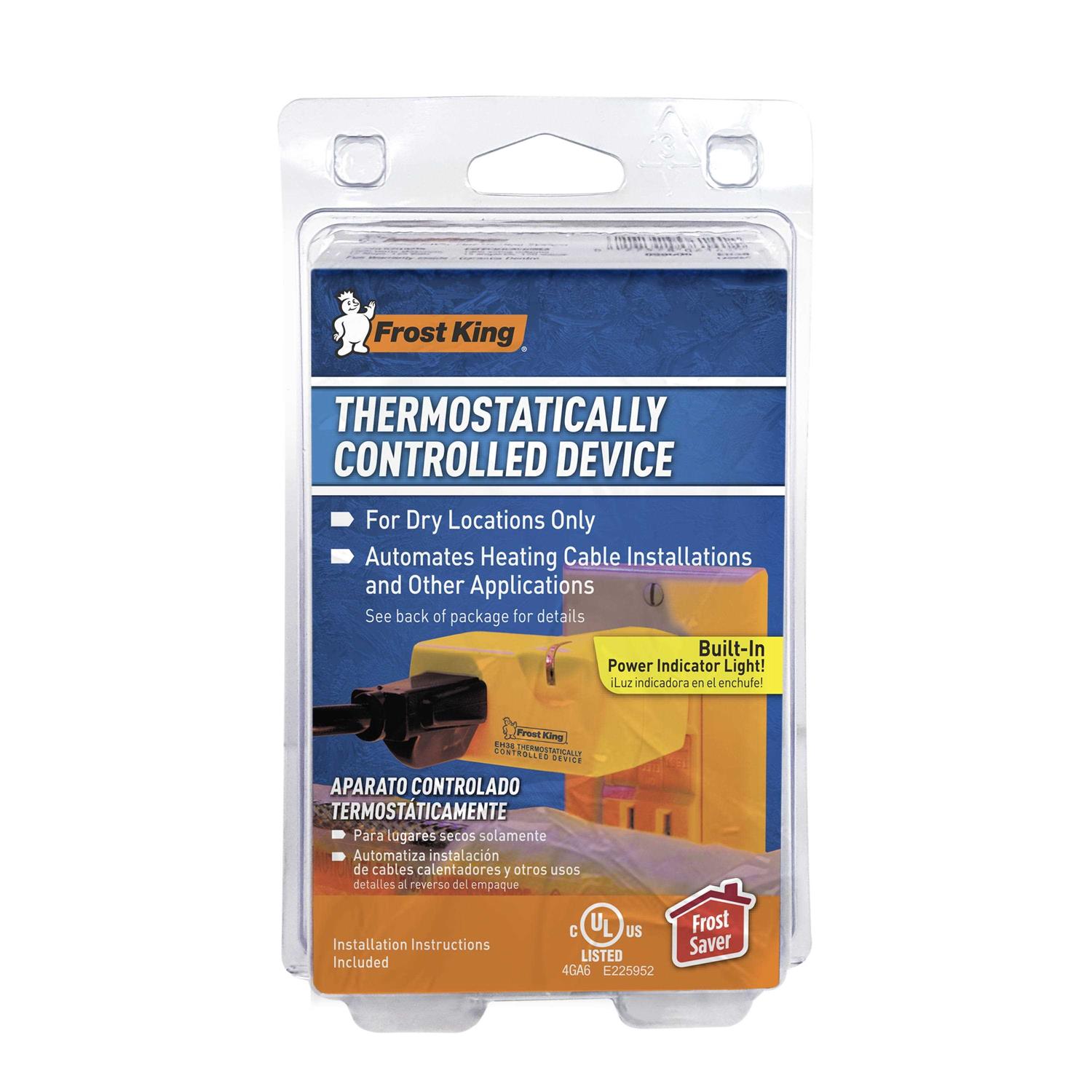 The Frost King 099000 self-regulating thermostatically controlled device for use with Frost King electric pipe heating cables turns power on and off automatically. The device has a grounded plug for use with GFCI outlets in dry locations. The power indicator light lets you know when the unit it is on and the power shuts off at about 54F to help save energy. The product can also be used with 120 VAC heaters, electric heaters, heat lamps and engine heaters.