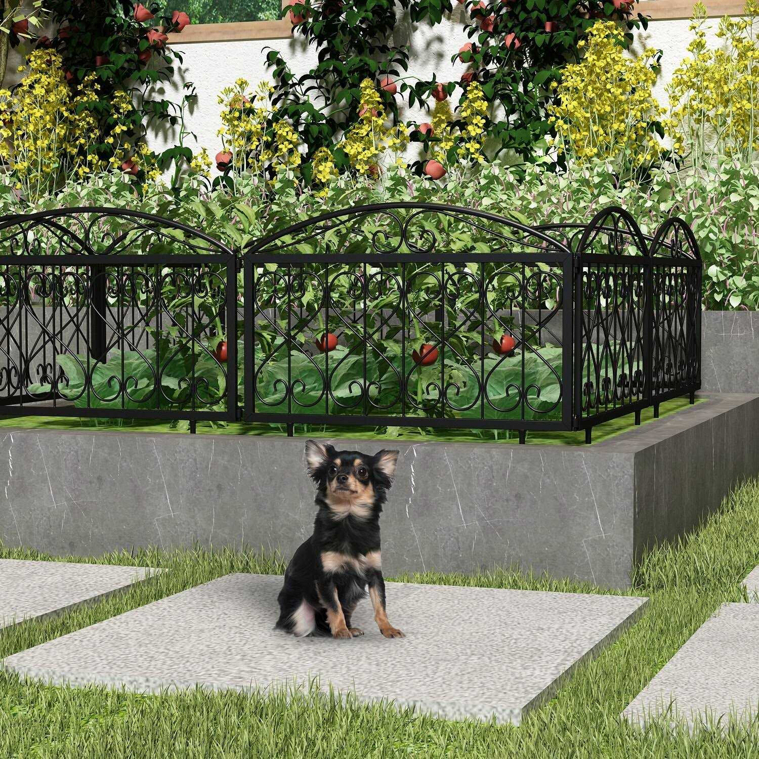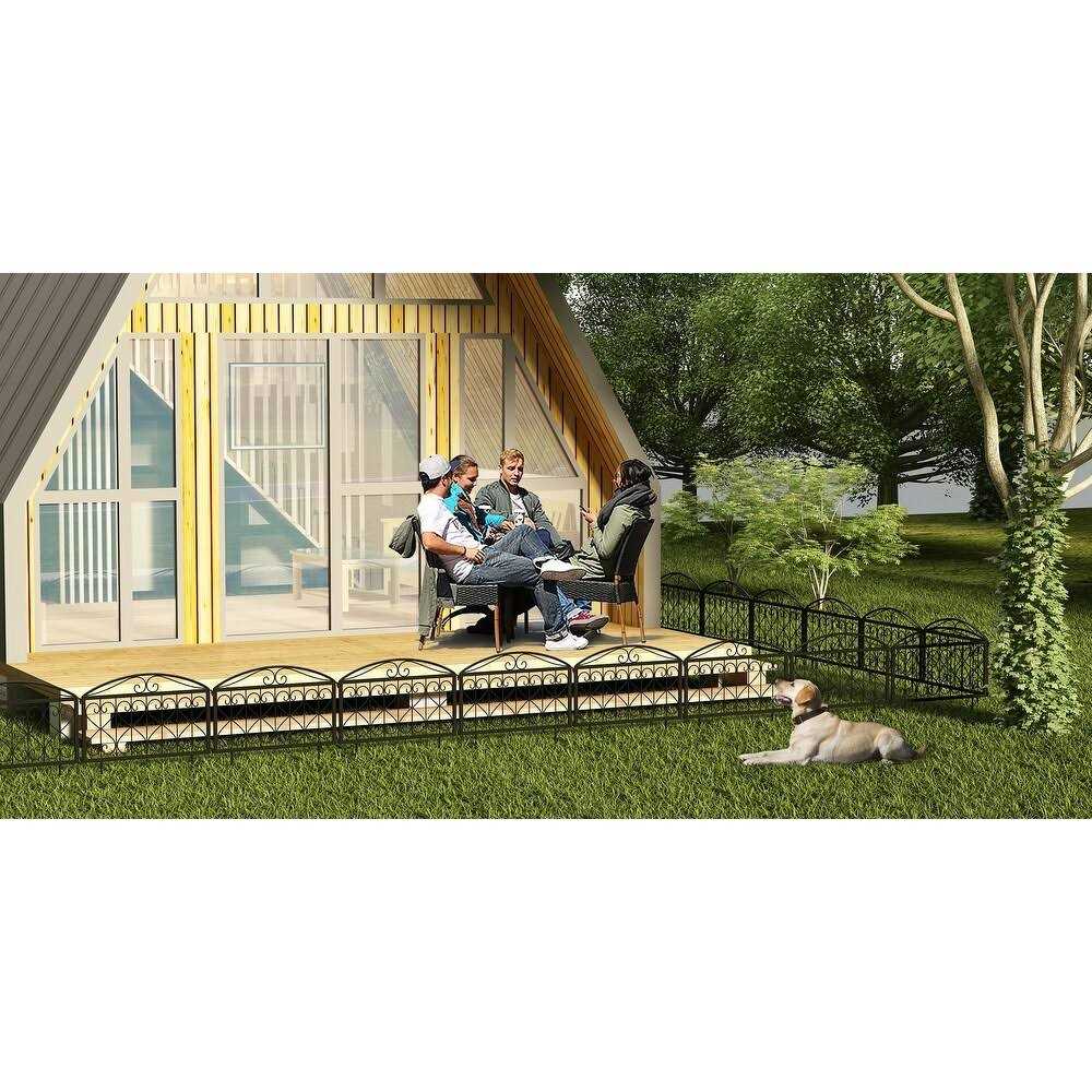 Protect your garden with this heavy-duty and sturdy metal fence border. Its tall fencing with a single panel size of 18.3 inch x 22 inch (4 panels in total) spans a length of 7.3ft. Made with thickened iron frames and welded wires, this fence gate is durable and designed to last for years. The decorative pattern on the top part of the fence panels adds an attractive touch to your garden, yard and patio. Features: Heavy-duty and sturdy iron frame Rustproof black powder-coated finish Easy to assemble with step-by-step instructions Multi-purpose garden fence for various uses High standards of customer care Other sections: Material: Thickened iron frame and welded wire Panel