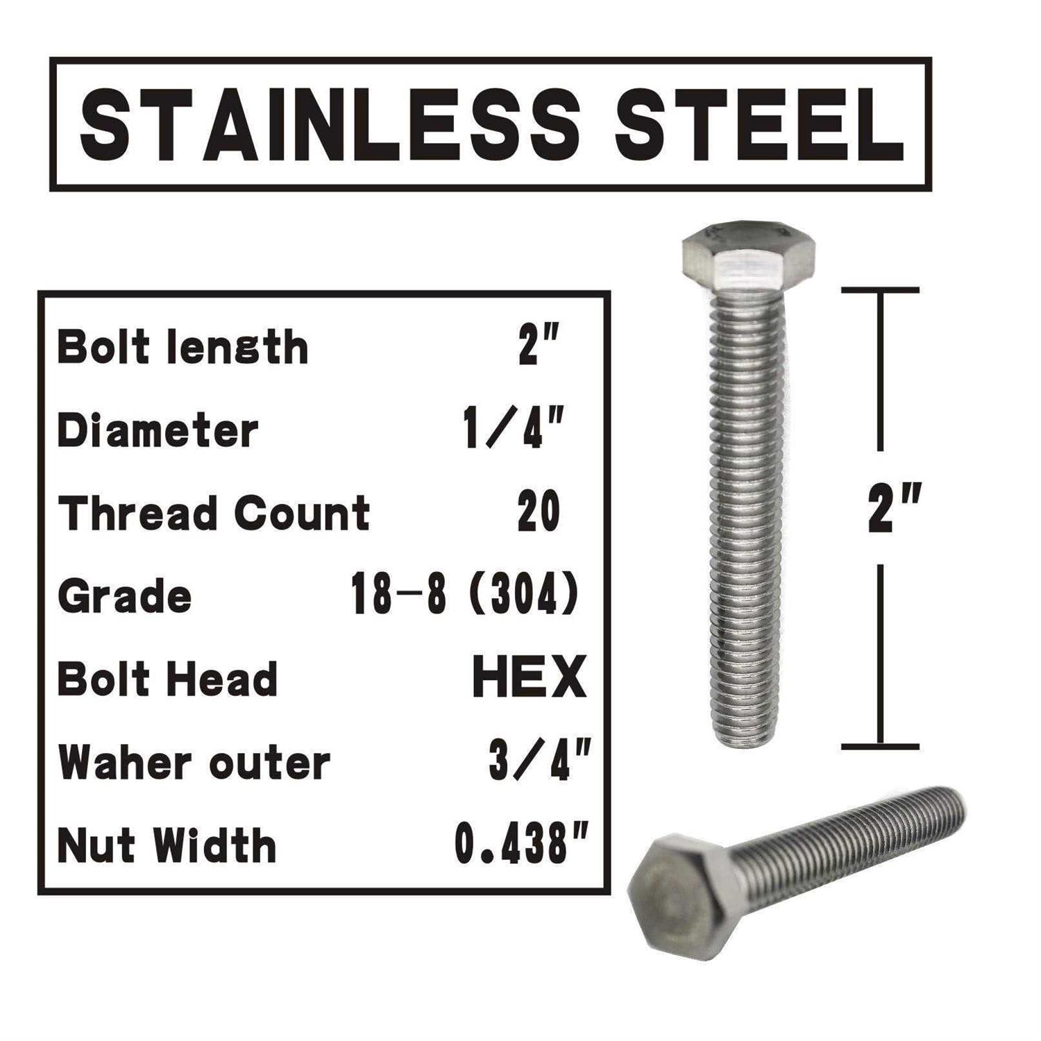 A Hexagon Bolt is a threaded fastener with a hexagonal head shape, and are designed to be installed using a spanner. Hexagon bolts are favoured for their robust shape, which makes them suitable for more heavy-duty fastening applications. Hexagon bolts are also generally available in larger sizes than alternative fasteners. As their name suggests, Full Thread Hexagon Bolts are fully threaded. This type of bolt is required when the shaft of a fastener is being inserted completely into a threaded hole. Fully Threaded Bolts are often used to securely fasten two threaded sections together. Made from 18-8 stainless steel, FullerkregR brand screws have good chemical resistance and may be mildly magnetic. Length is measured from under the head. Screws that meet ASME specifications comply with these dimensional standards.DIMENSIONS: Diameter: 1/4″ | Length: 2″ | Thread Type: 20 tpi Coarse Thread (Standard) Package includes ten each of bolts, hex nuts , Flat & Lock washers