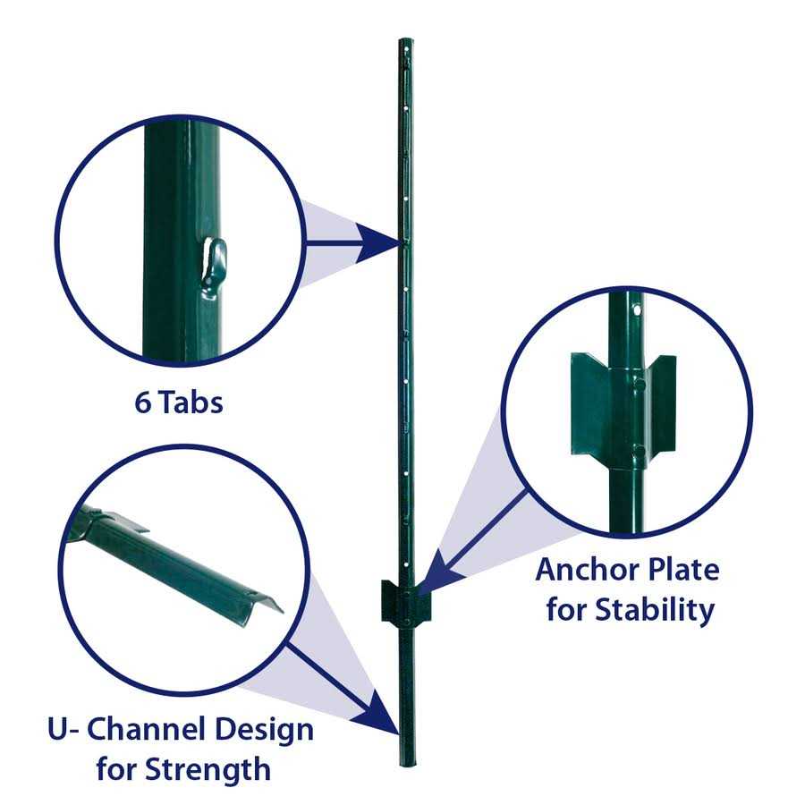 The U-post is a powder-coated steel post designed for lighter duty applications. Powder-coated finish provides added durability and helps prevent rusting. The studded design allows you to attach and secure your fencing product to the post with ease. No digging required for installation, simply drive posts into ground. Often used for fencing in gardens with chicken wire or other light duty wire.