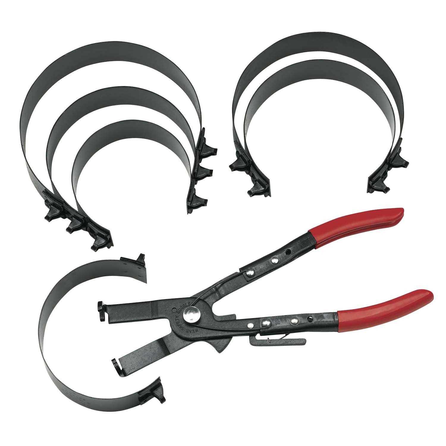 Install pistons from 2-7/8″ to 4-3/8″ (73mm to 111mm). Has a Fine-tooth ratcheting lock. Set includes pliers and 6 bands. Pliers can be used parallel or perpendicular to the cylinder blockThis quality set includes pliers and 6 bands. It install pistons from 2-7/8 to 4-3/8″ (73mm to 111mm). Set works by placing a band around the piston, covering the rings and hooking pliers into the band, then squeezing. With the band lightly around the piston, insert piston into cylinder and tap lightly with hammer handle to install. The Fine-tooth ratcheting lock allows you to compress bands in small increments. The great thing is the pliers can be used parallel or perpendicular to the cylinder block.