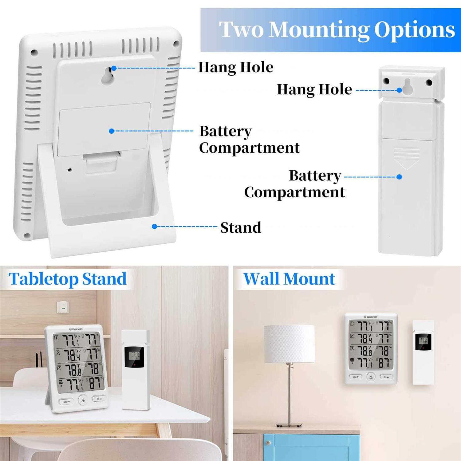 Features: nn–Accurate Temp&ampHumid Readings Wireless indoor thermometer for home with large LCD display measures the real-time temperature and humidity with past 24 hours Max/Min records and trends arrows. Assess historical data and refer to the Comfort Indicator to quickly know your home living conditions. Works with the hi/lo temperature and humidity alert function, helps create more healthier lifestyle.n–Come with 3 Wireless Sensors Indoor outdoor temperature and humidity monitor supports to be connected to display readings from 4 different places simultaneously up to 200FT/60M apart Wireless Frequency: 433 MHz. Monitor your whole home, basement or greenhouse confidently with the digital thermometer and humidity gauge.n–Wide Measuring RangeInside outside thermometer wireless measures indoor temperature from 50F 140F-10C 60C , and outdoor temperature from -58F 158F-50C 70C with 1C accuracy. The indoor and outdoor humidity range is 20%-95% with 5% accuracy. W.