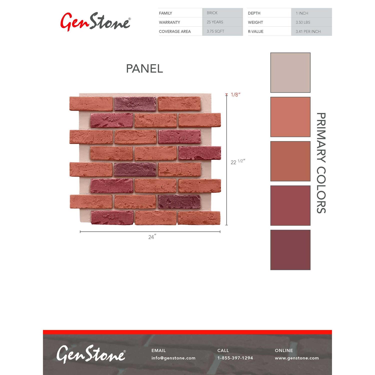 DescriptionGenStone brick veneer profile offers the natural appearance of authentic American brick, but without the weight and the difficulty of installing masonry brick. This product is panelized to provide a dramatic texture and aesthetically appealing design, which is ready to be installed from the box to the wall in minutes using screws and common tools. The unique interlocking joints of the panels provides a seamless application while installing 3.61 sq. ft. of coverage per panel results in fast project completion. A GenStone brick panel stands 22.50 in. tall and stretches 22.25 in. wide. These lightweight panels weigh only 3.50 lbs. each and provide an R-value of 3.41 per inch. Do-it-yourselfers will appreciate the year round ease of installation and the enhanced curb appeal of your home or building. A variety of accessories are available including ledgers, inside corners, outside corners, inside corner ledgers, outside corner ledgers, left and right finished edge pieces and trim to provide an effortless professional finish. GenStone brick veneer panels are cast from real tumbled brick into our proprietary molds. Each panel is made by compressing a combination of polyurethane and additives into a durable wood-like material before it is hand painted with 12 coats of premium exterior paint.
