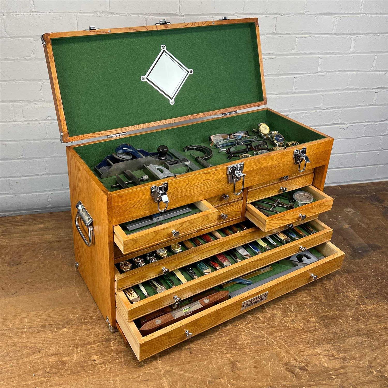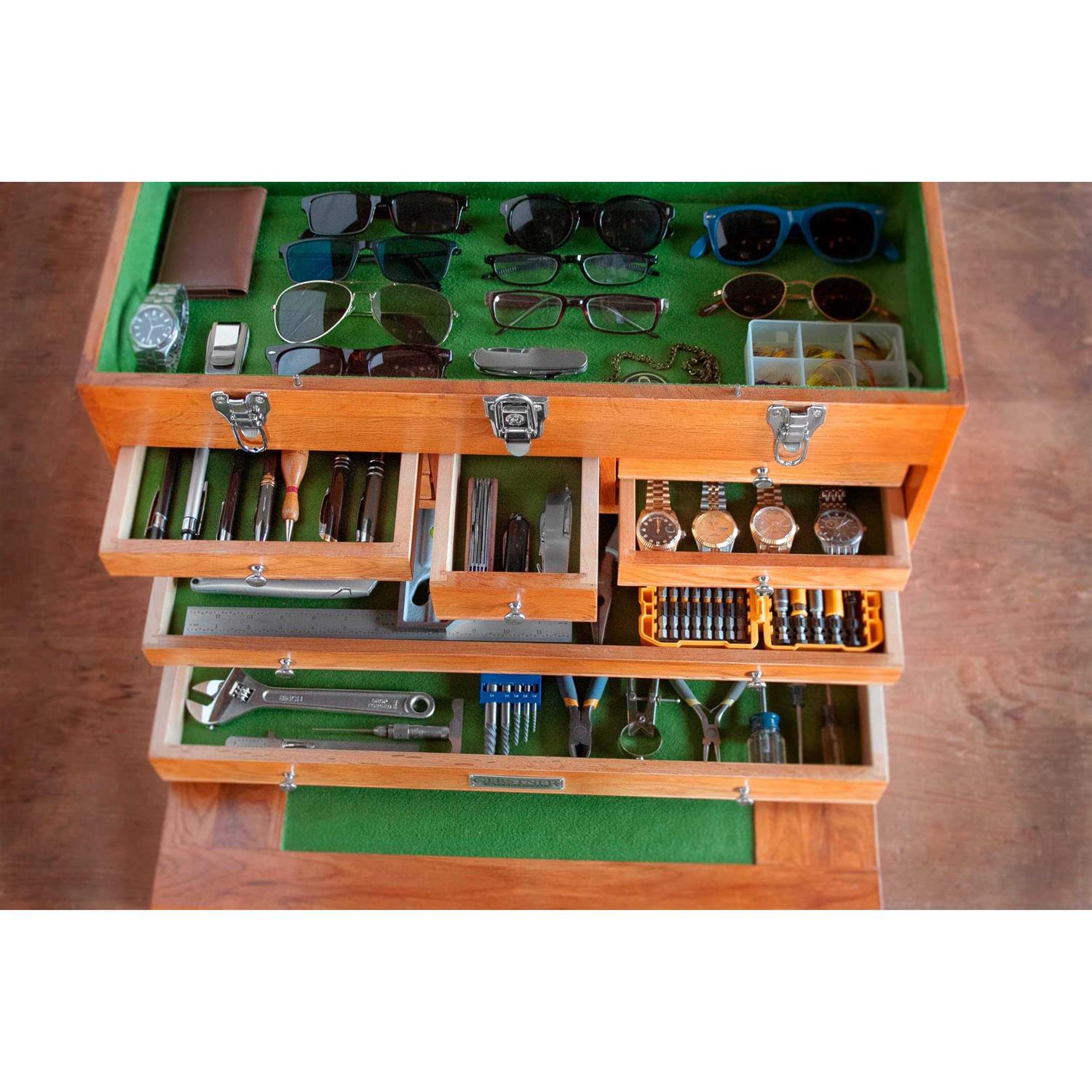 The T-24 Red Oak 11-Drawer Top Chest is a classic American style chest, constructed of red oak hardwood and red oak veneers. This is a great chest for toolmakers to store their precision tools. It is also suitable for all kinds of home use. This chest is perfect for a multitude of uses ranging from moisture free storage of precision hand tools to hobby storage. – Features6 medium, 2 narrow and 3 full width drawers – Green felt lined drawers – Red Oak hardwood & Red Oak veneers protects from moisture – Polished chrome plated hardware – Hand rubbed stain with lacquer finish – Front lid stows under drawers in the open position, and covers drawers in locked position – Overall Dimensions: 24″ W x 10″ D x 15-7/8″ H