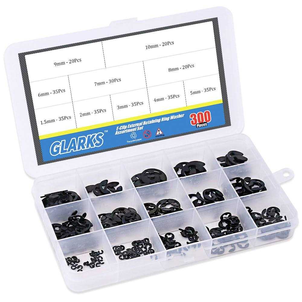 Glarks 300-Pieces 10 Size Black Alloy Steel E-Clip External Retaining