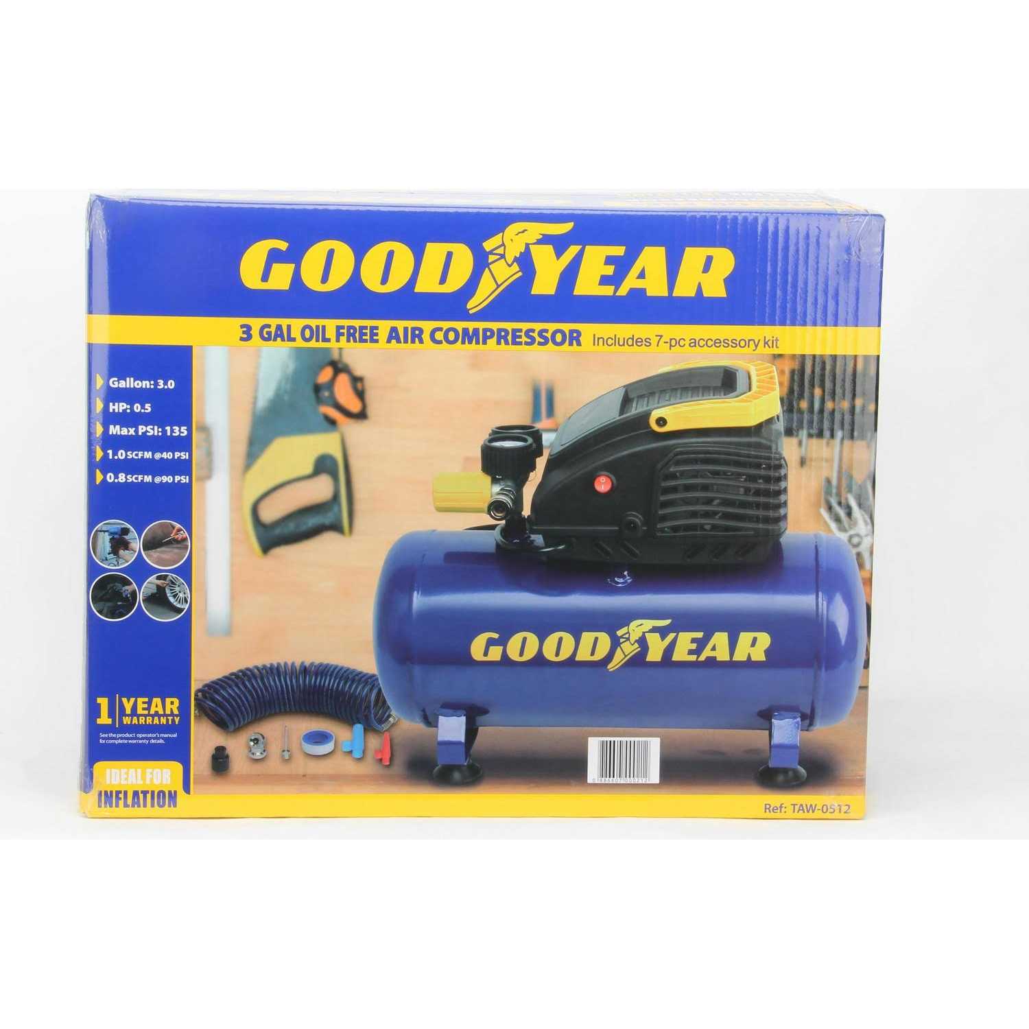 This Goodyear 3 Gallon Air Compressor has a .5Hp long lasting Induction Motor. It has an oil free and maintenance free pump. The Goodyear 3 gallon is light weight with and an ergonomic handle for easy portability. This small unit boast of 135 psi and 1 SCFM @ 40 PSI. It runs off standard 120 Volt household current. This unit is great for inflating tires, operating a brad nailer or stapler and other small house hold jobs. Hose and accessories are included. Color: Blue.