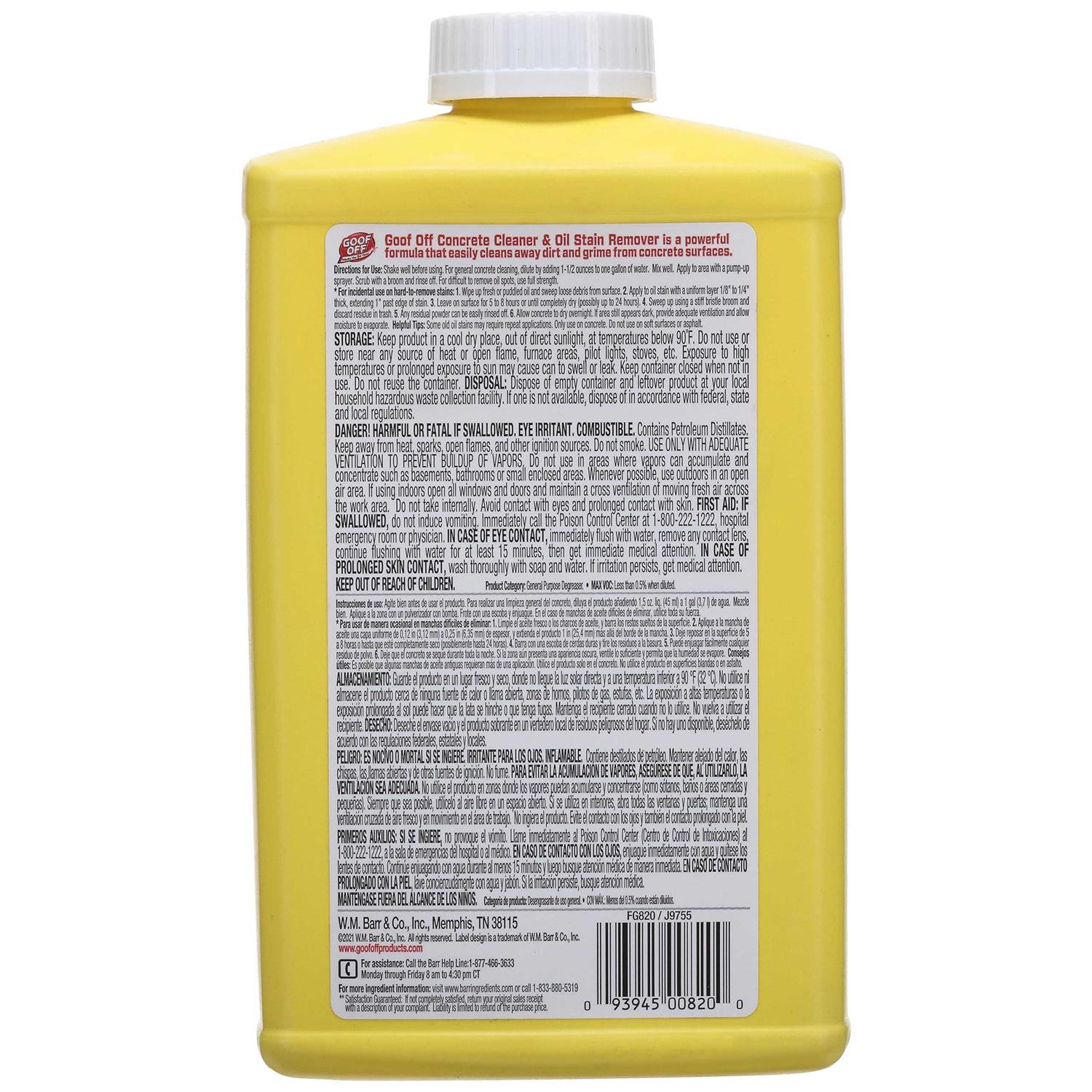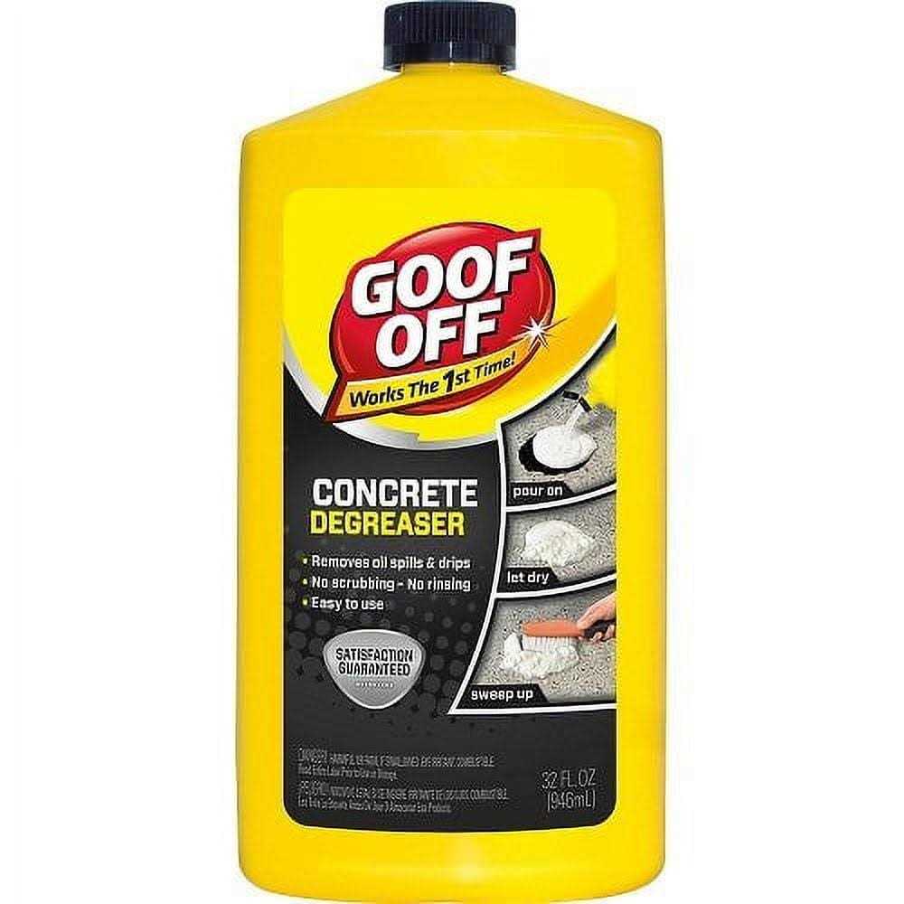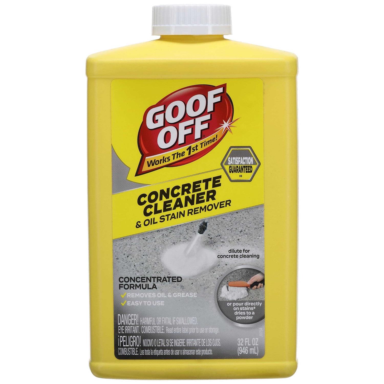 - Goof Off Concrete Cleaner and Oil Stain Remover cleans grease and oil from concrete
