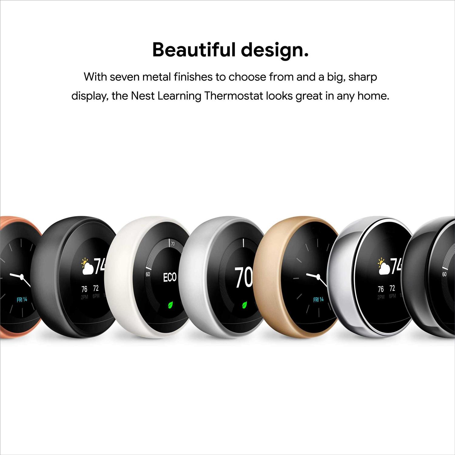 The Nest Learning Thermostat is a smart thermostat that learns your schedule and programs itself to help save energy. You can control it from anywhere with the Nest app, and it works with Alexa and Google Assistant so you can adjust the temperature with your voice. And it’s beautifully designed, with a big, bright display and metal finishes to suit any home’s style. Google Nest Learning Thermostat (Copper) packaged with a Google Seal for Online Marketplace. [1] Remote control and mobile notifications require working internet and Wi-Fi. [2] Alerts can notify you of a potential issue with eligible HVAC systems. Alerts aren’t intended to replace a diagnosis by a qualified HVAC professional. [4] Voice control requires a compatible device, and working internet and Wi-Fi.